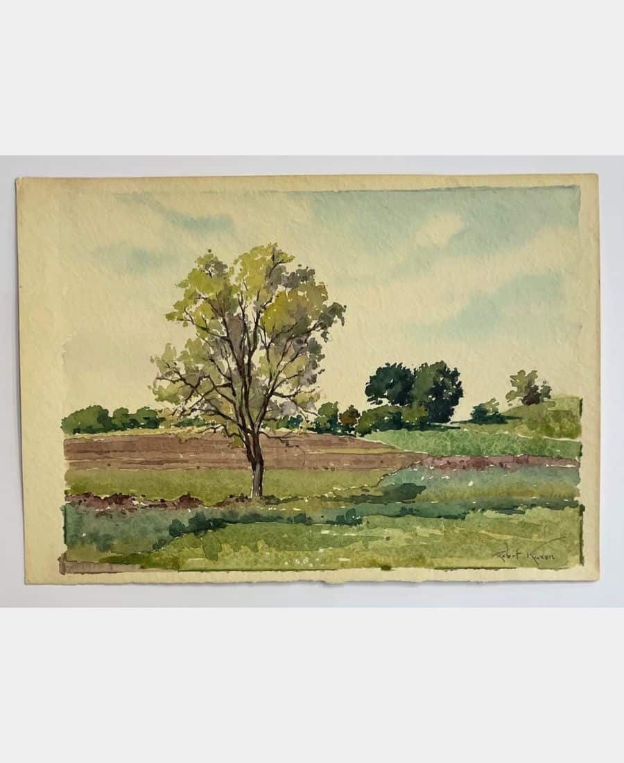 Paysage à l’arbre. Robert Kuven (Strasbourg, 1901 – 1983, Strasbourg). Aquarelle. Signée en bas à droite. Format du feuillet : 22 x 31,5 cm. Format du sujet ; 20,6 x 28,4 cm.