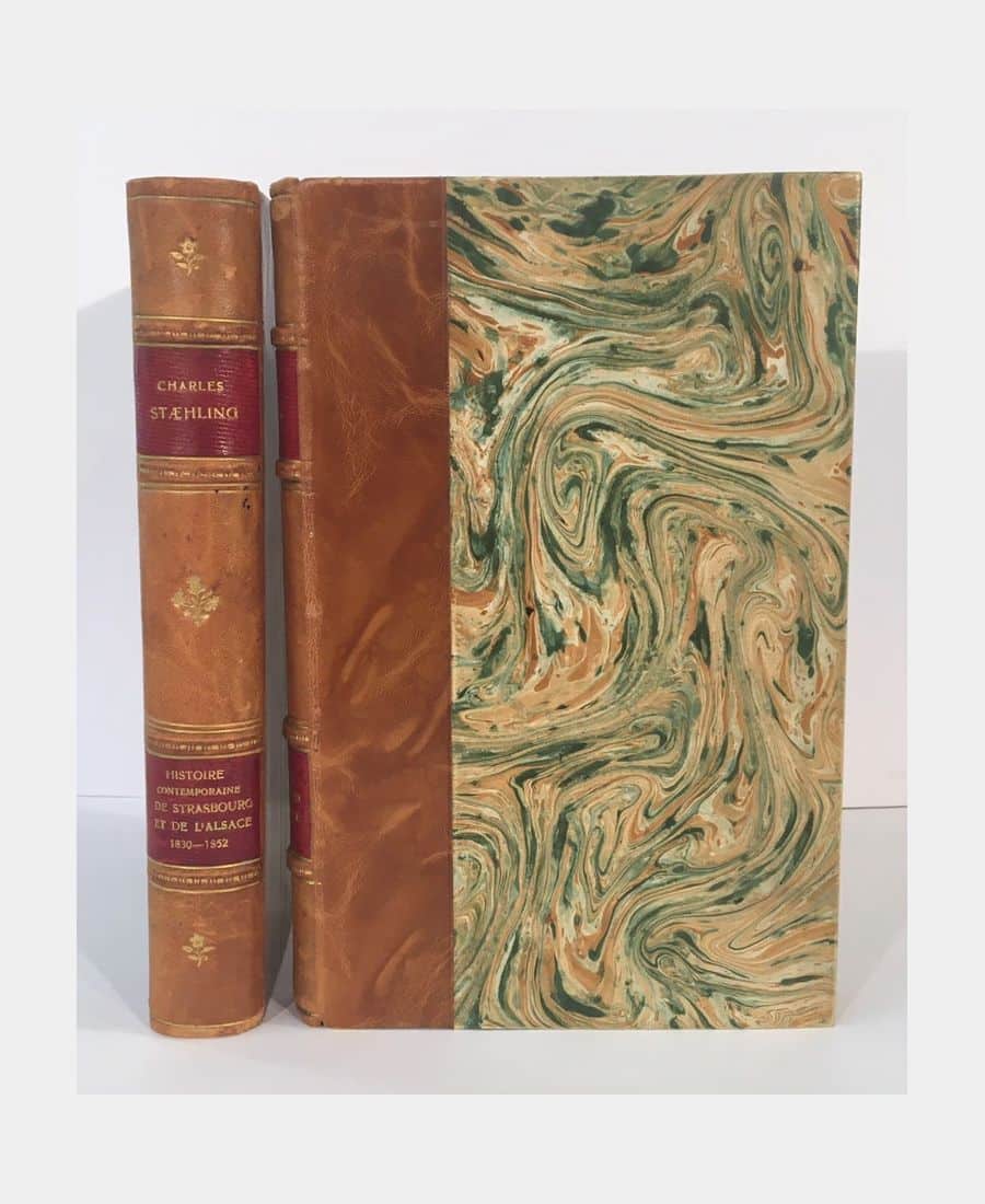 Nice puis Nancy, Imprimerie Victor-Eugène Gauthier et Co puis Imprimerie Berger-Levrault et Cie, 1884 puis 1887 ; deux volumes in-8° de XII, 429 pages et VII, 463 pages. Half marbled basane, spine ribbed and decorated with gilt fleurons and friezes, red title and author, top edge gilt. A complete copy of the two volumes, the first published in 1884 in Nice, the second in 1887 in Nancy. Only the latter is numbered, one of 300 copies. Author’s letter to Professor Grucker. Very slight spotting to spine, otherwise a fine copy.