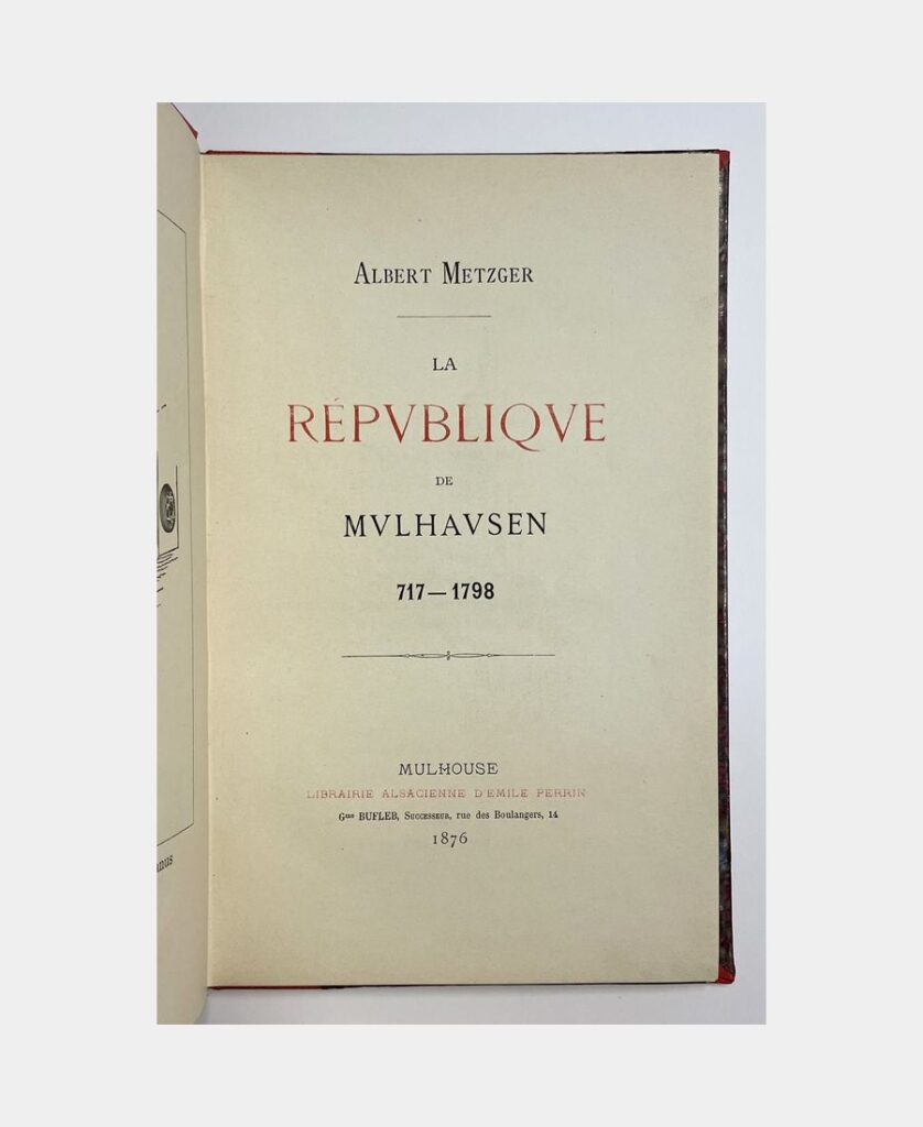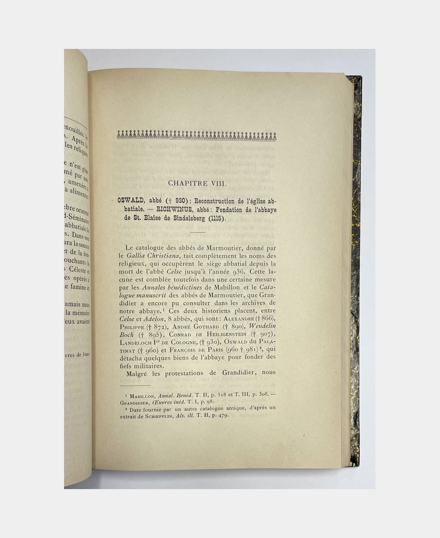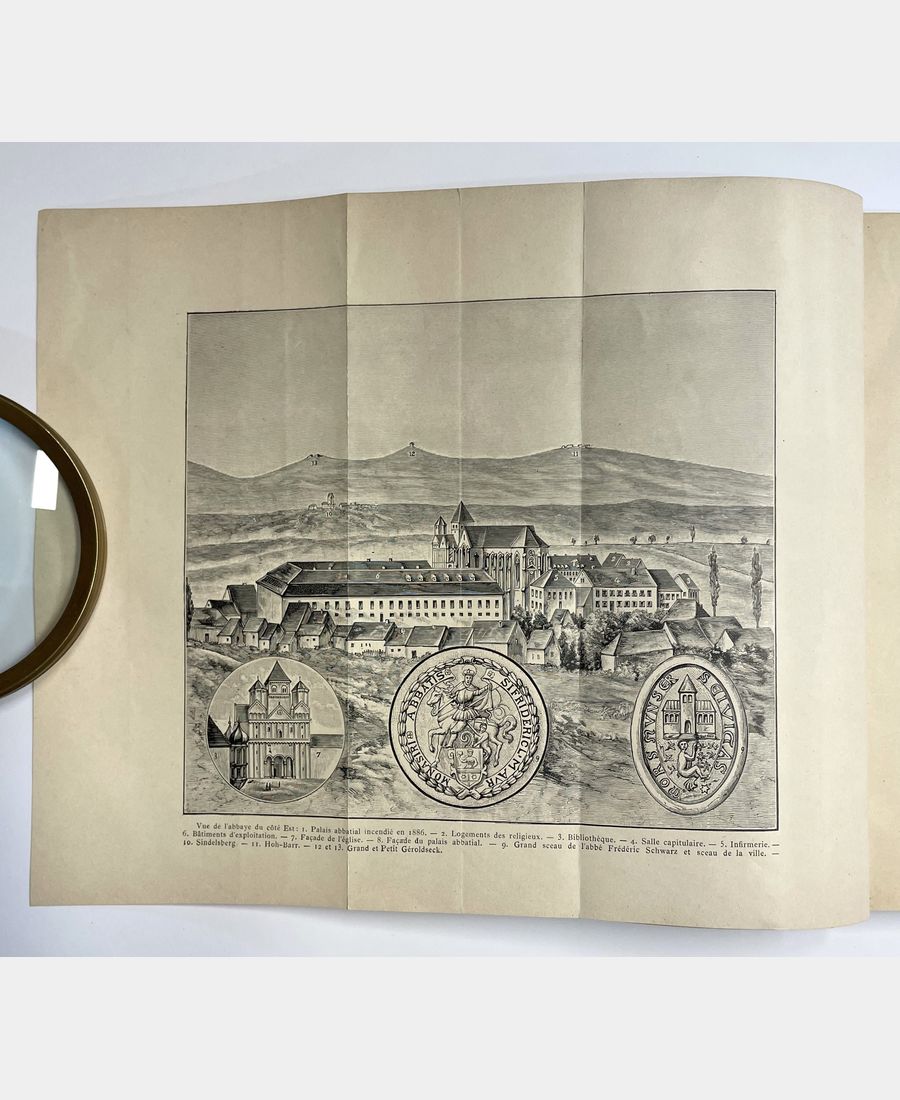 Strasbourg – Paris, F. X. Le Roux & Cie – Victor Retaux, 1899 ; in-8 de 348 pp.. Demi-toile grise postérieure avec pièce de titre au dos. Le plat supérieur de couverture imprimée est conservé. Bien complet du frontispice. Etude sur l’abbaye de Marmoutier et l’histoire des institutions de l’Ordre de Saint Benoît du Diocèse de Strasbourg par Félix Jacques Sigrist, curé de Bitschhofen et historien. Le tome premier paru seul en 1899, la seconde partie étant restée inédite et retrouvée à la cure de Marmoutier dans les années 2000 (Wolff J.-Cl., Nouveau Dictionnaire de Biographie alsacienne).
