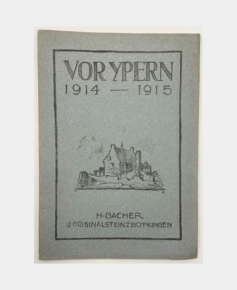 Strasbourg, Elsässische Druckerei (Fischbach), s.d. ; in-folio, 2 ff.n.ch. including title page and table of contents and 12 lithographed plates, in lithographed cover. Two stains on back cover. Lithographed suite by Henri Bacher (1890 – 1934), then mobilized in the German army, which bears witness to the violent bombardment of the town of Ypres in Belgium. Complete with 12 plates.