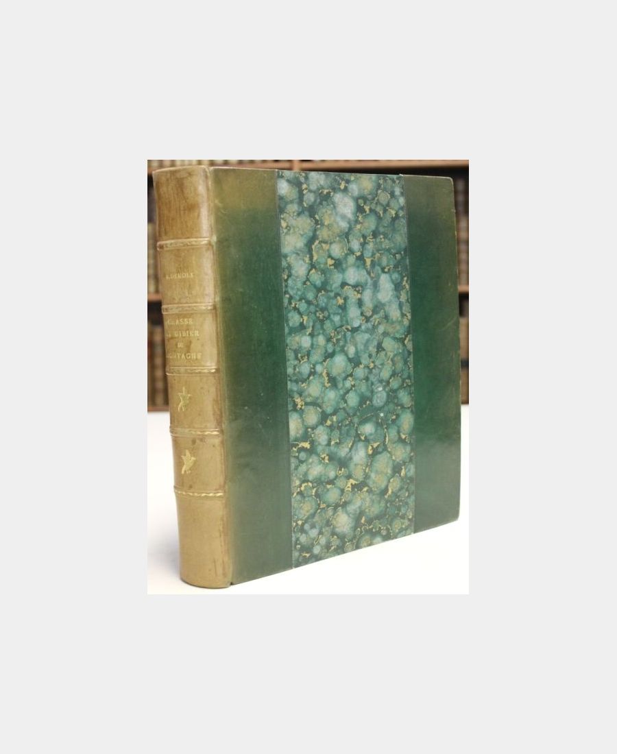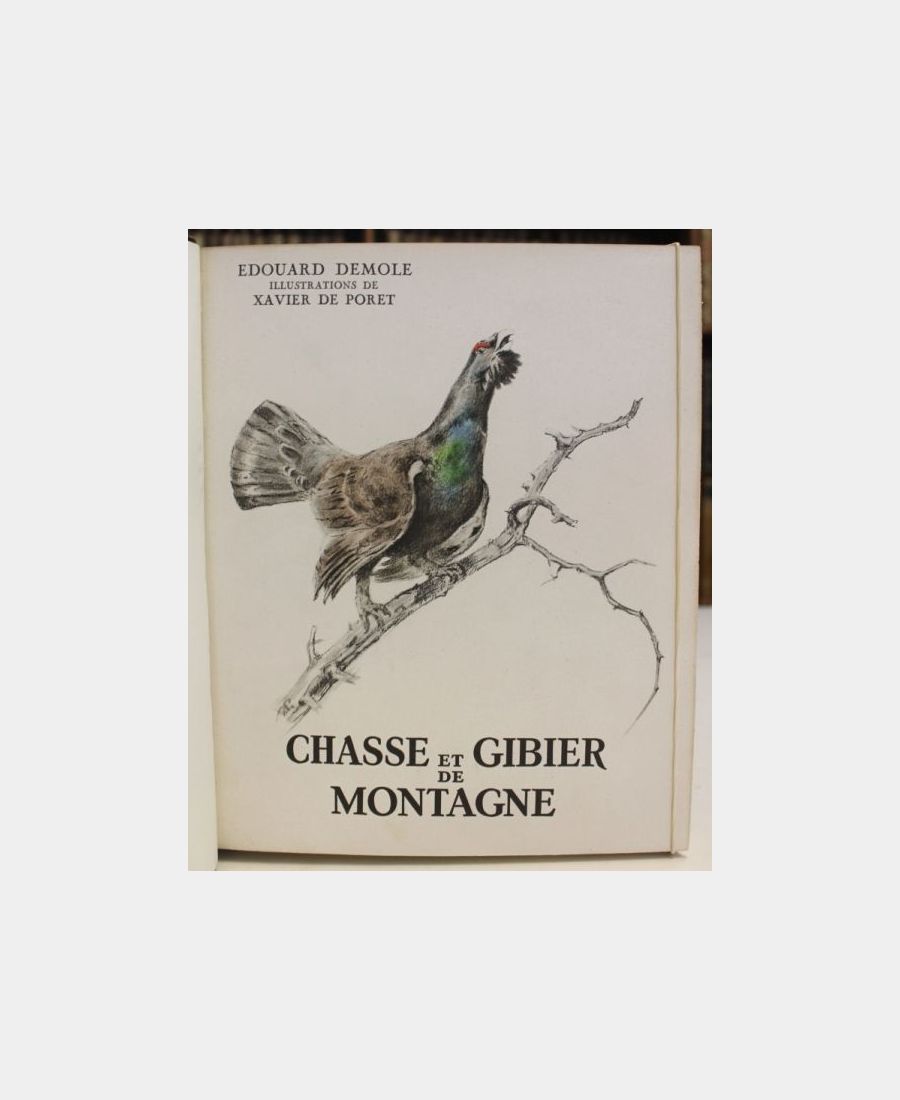 Paris, Durel, 1948; in-4 (281×232), 185 pp. 8 plates hors-texte. Demi-basane, spine ribbed, titled and decorated, oversewn, gilt-lettered head. Original illustrated cover and spine preserved. Book on hunting and game in the Alps illustrated by Xavier de Poret (inside and out), followed by photographic documentation plates comprising 41 figures. A copy on vellum from the papeteries de Rives (n°142 of 350). A fine copy.