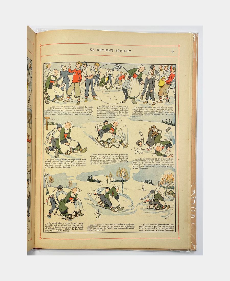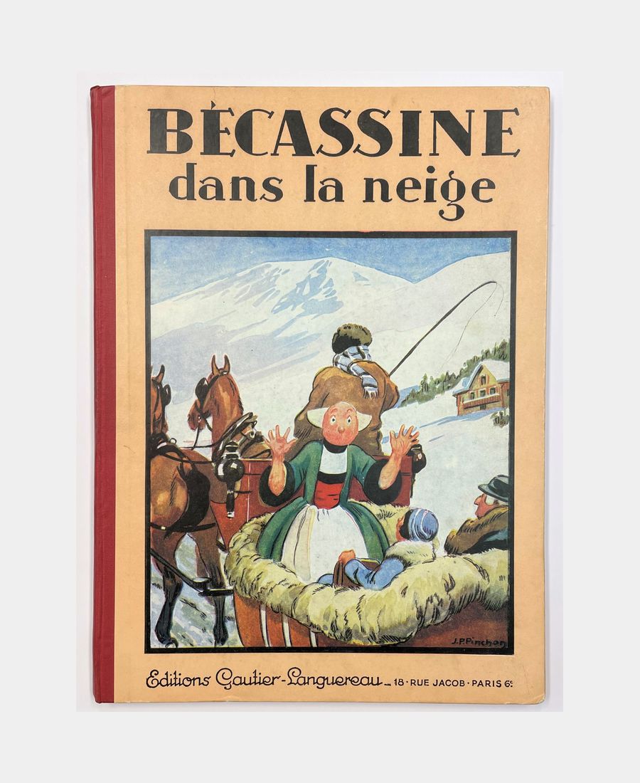 Paris, Editions Gautier-Languereau, 1933; in-4, 63 pages. Publisher’s boards, illustrated in color, red cloth spine. Minimal foxing, inside very fresh. A very fine copy of this original edition of Bécassine’s adventures in winter sports.