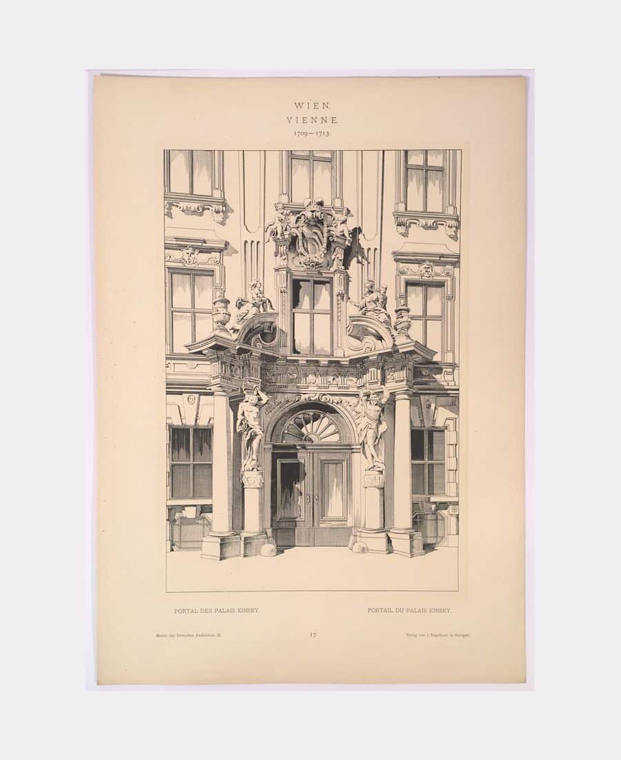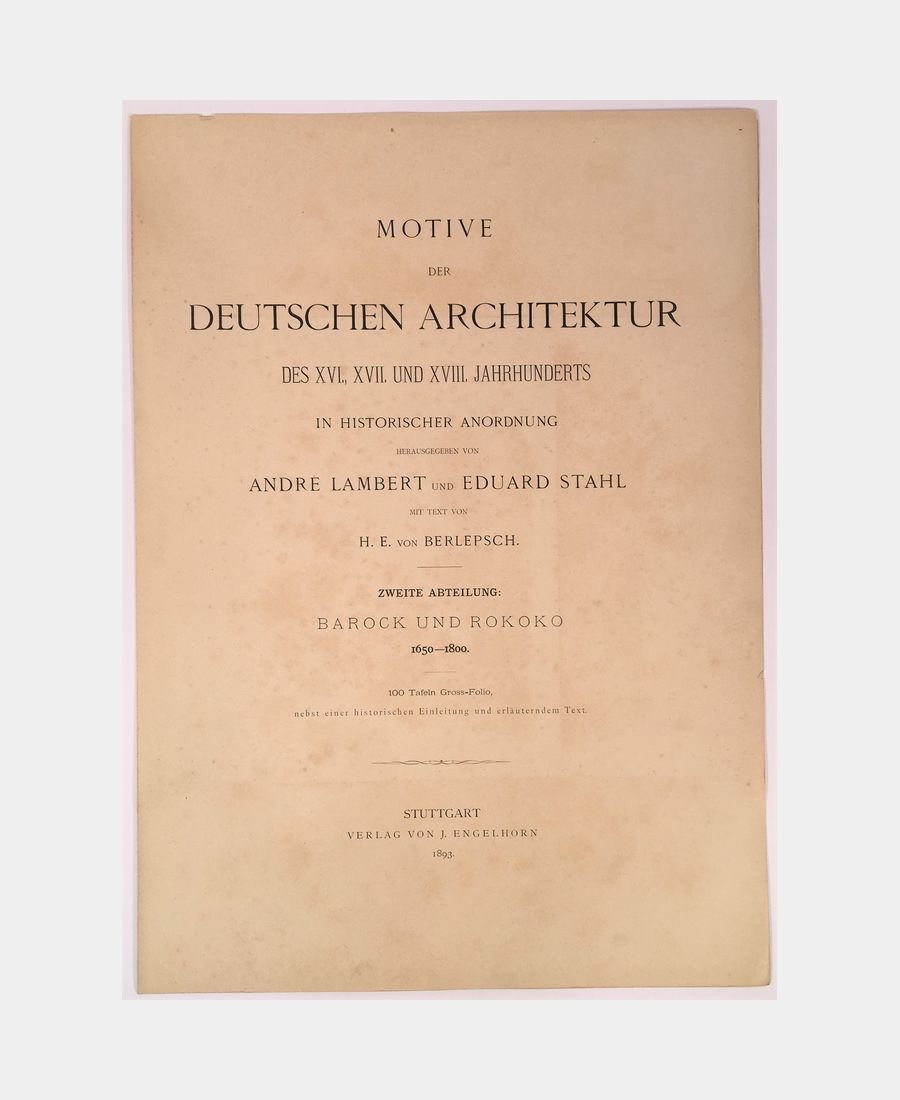 Stuttgart, Verlag von J. Engelhorn, 1893. Large folio of LIII pages and 100 plates in publisher’s hardback dust jacket with flaps, top cover with printed title and border. Complete with illustrated historical introduction and 100 plates showing Baroque and Rococo architecture from 1650 to 1800 in Germany, Austria and Switzerland. Some foxing on title page and flaws on boards, stamp on upper cover. The plates are in fine condition.