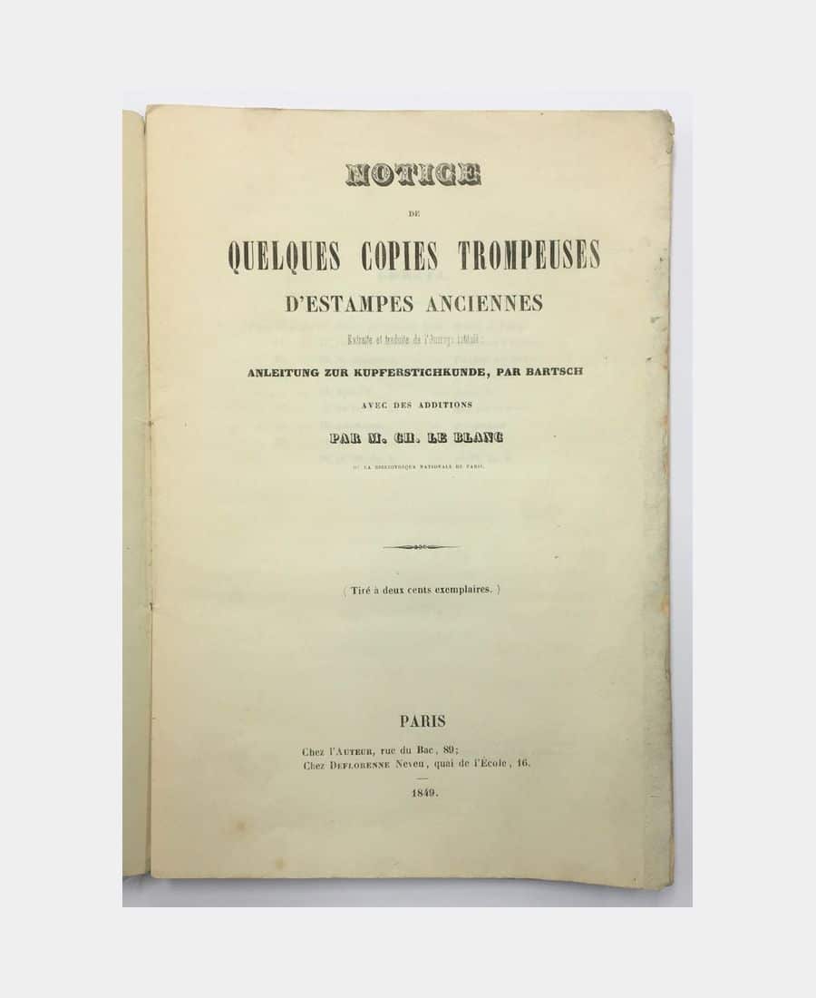 Notice de quelques copies trompeuses d’estampes anciennes. Bartsch (Adam, von), additions by Le Blanc (Charles). 1849.