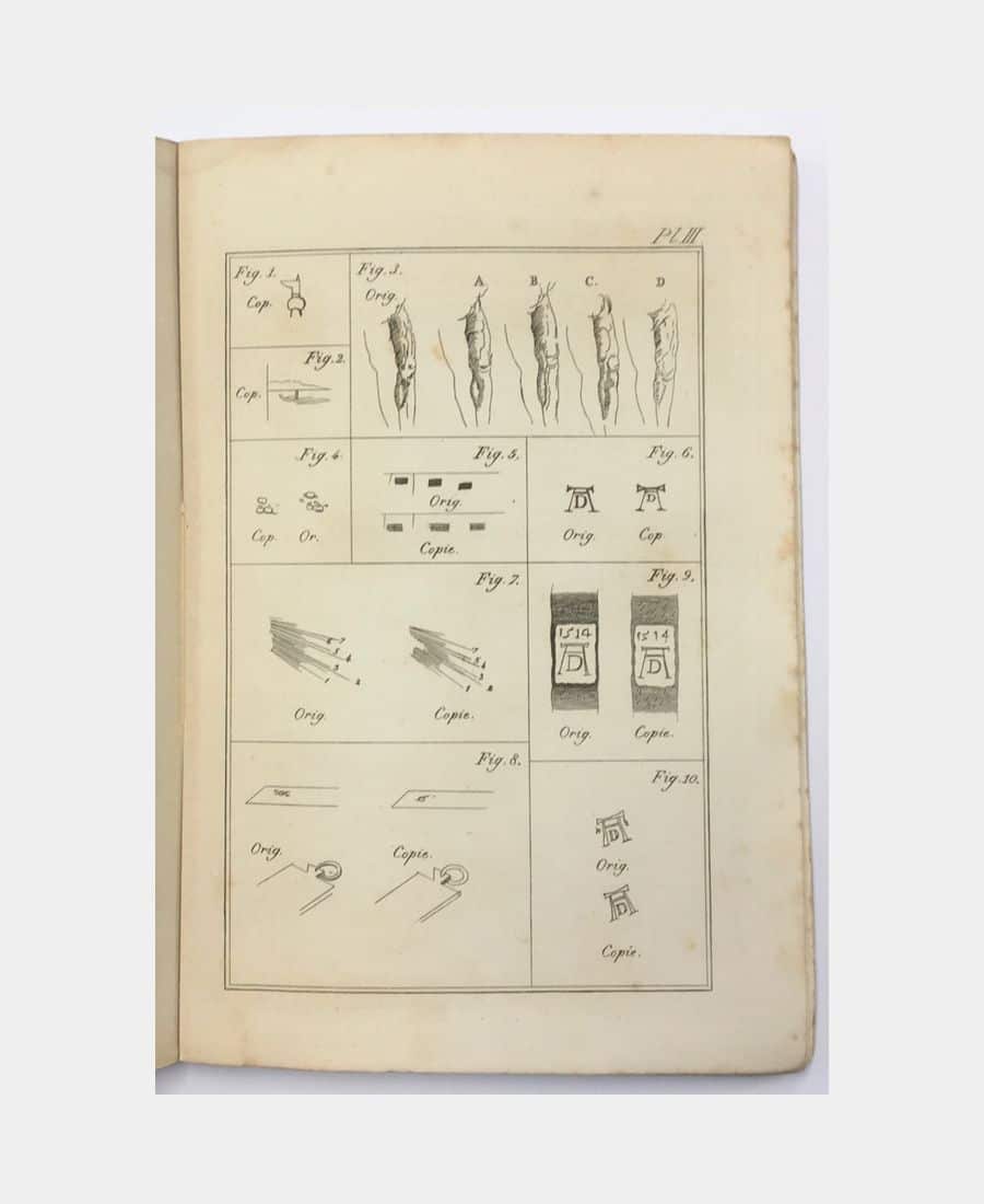 Paris, chez l’auteur, chez Deflorenne Neveu, 1849; in-8, 35 pages, 13 plates hors-texte. Paperback, in original blue muffled cover. Some foxing on the plates. Edition of 200 copies. The 108 figures on the 13 plates reproduce the elements that distinguish an original master print from a copy.