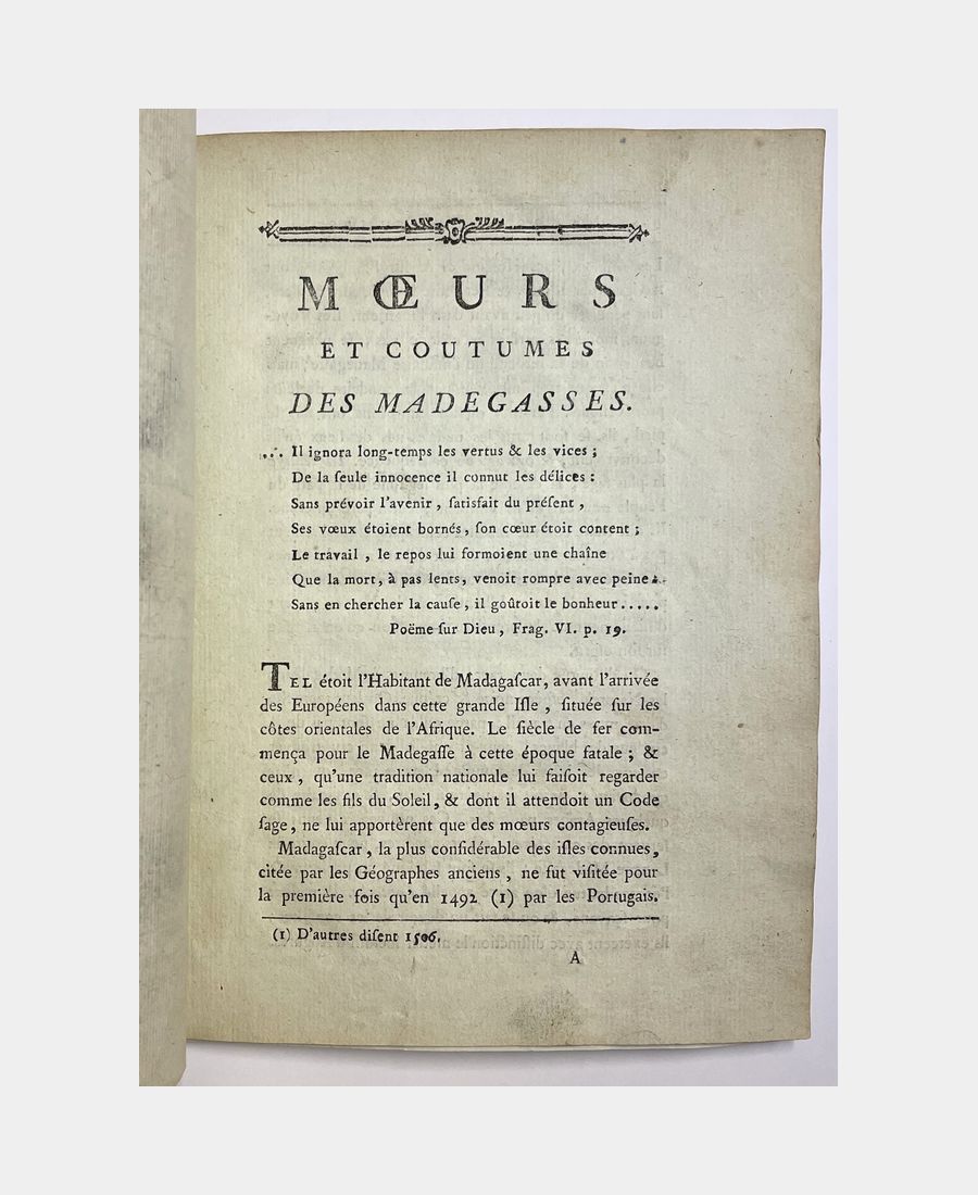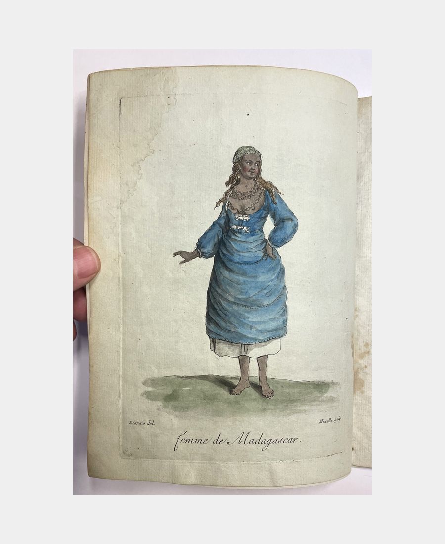S.l., s.n., s.d. ; in-12 paperback of 6 leaves under marbled paper cover. Marginal staining and foxing. Excerpt from the 1787 Civil Costumes of Africa on Madagascar, complete with text and 2 engravings by Mixelle after Desrais, hand-colored in the period.