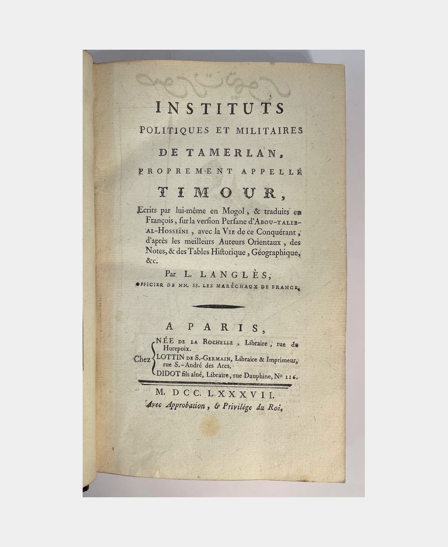 Paris, Née de La Rochelle, Lottin, Didot fils aîné, 1787; in-8 of 4 f.n.ch., 122, 401 pages. Later half calf, spine with 5 faux-nerfs, fleurons and cold-stamped fillets, author, title and fillets gilt. Minor brown spots. Complete with frontispiece portrait and folding map. Two parts in one volume. First French translation of the Tuzuk-i Timur by the orientalist Louis-Mathieu Langlès, who was behind the creation of the Ecole des Langues Orientales and the first holder of the Persian language chair at Lakanal’s request (decree of 10 germinal year III). Preceded by a biography of Tamerlan, spiritual descendant of Genghis Khan, who reconstituted the ancient Mongol empire through his numerous conquests. A very fine, carefully bound copy.