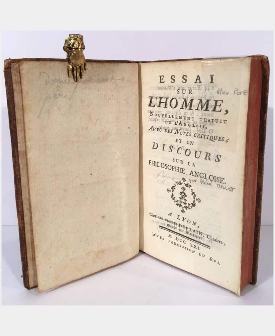 Lyon, Frères Duplain, 1761; in-16 (146x88mm), LIV, 244 pp. Bound in full calf with ornate spine bands, title page. First edition of this French translation with critical notes and a discourse on English philosophy by Abbé Cl. Fr.-Xav. Millot. Upper spine split and top corners slightly dulled, but a fine copy.