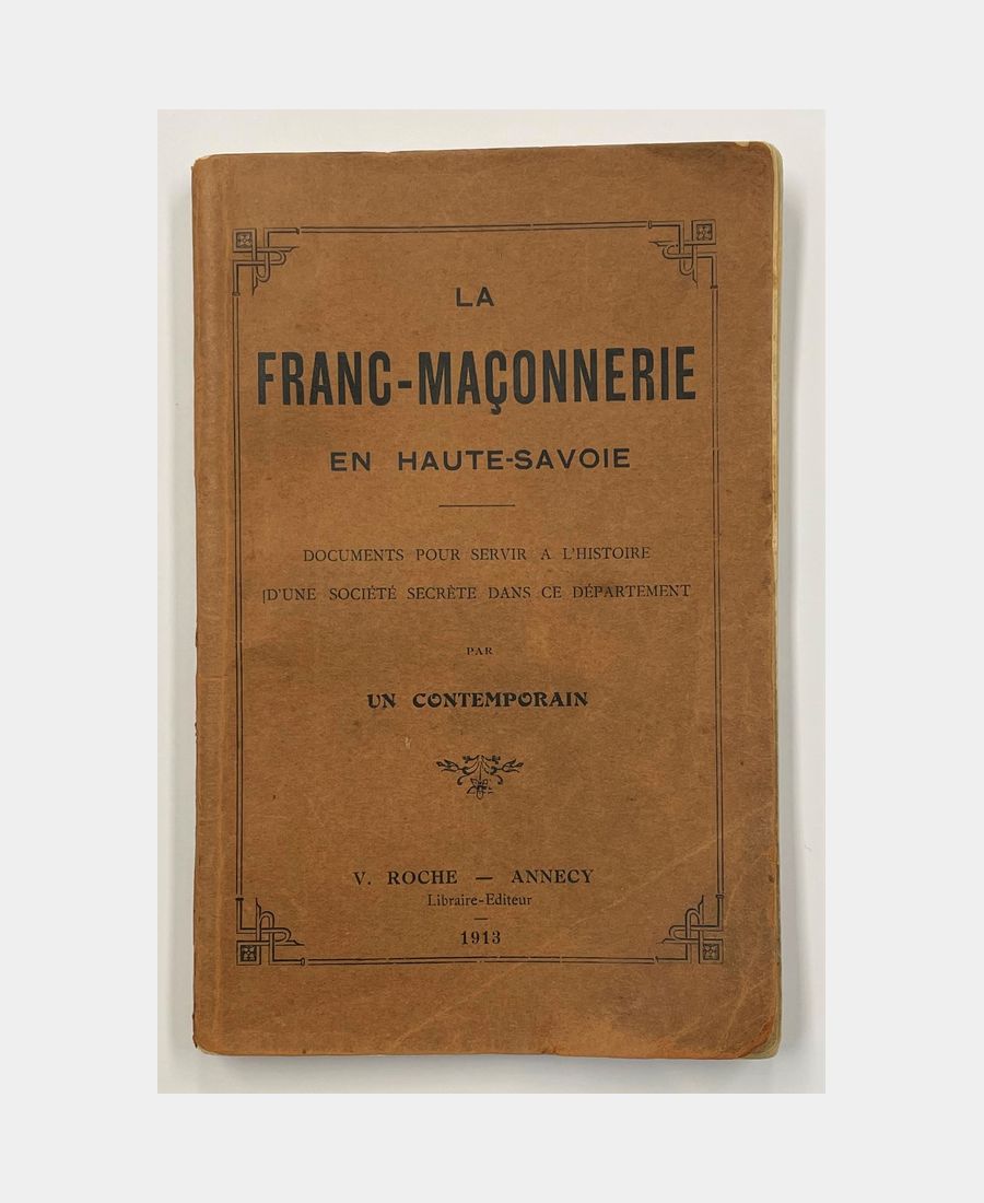 Annecy, V. Roche, 1913; in-12 paperback, 110 pages. Printed cover and spine. Bends to lower corner of upper cover, spine and text else internally clean. Documents pour servir à l’histoire d’une société secrète dans ce département. Anti-Masonic book by Abbé Tissot.