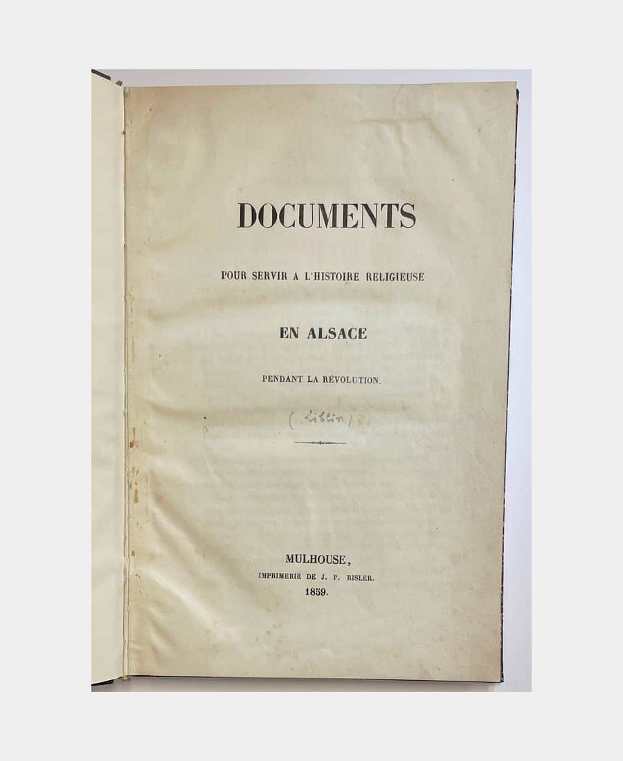 Mulhouse, Imprimerie de J. P. Risler, 1859; in-8 of 3 f.n.p., 102 pages. Half cloth. Label on first board, some marginal restorations. First part on the doctrine of constitutional clergy, second part on the doctrine of refractory clergy. Bookplate of Léonard Georges Werner by Emile Weber.