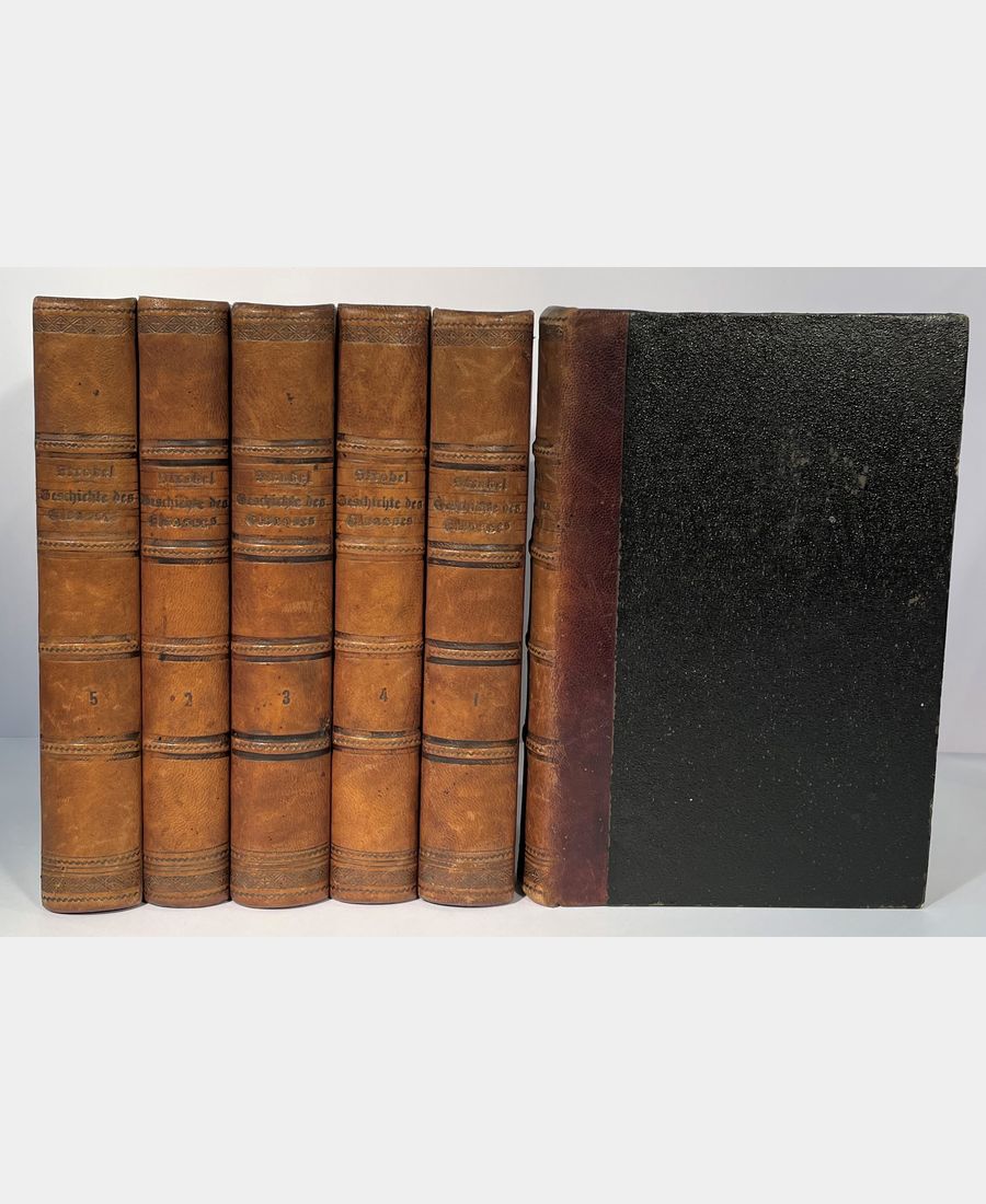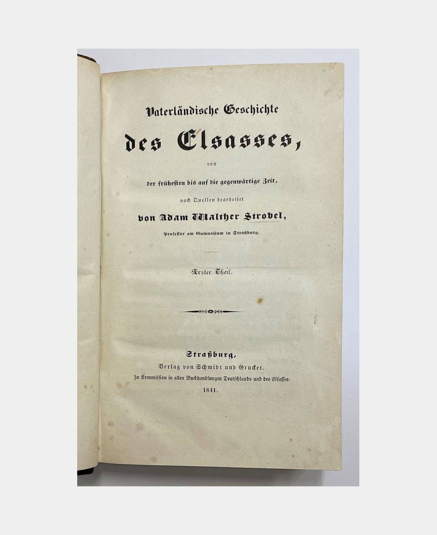 Strassburg, Schmidt und Grucker, 1841-1849; 6 volumes in-8 with 541, 462, 571, 489, 568 and 628 pages. Half-chagrin, spine ribbed with author, title and tomaison, decorated with cold fillets. Reversal of the tomation on the spine bindings of volumes 1 and V, slight spotting, notably on the lower board of the 6th volume, scattered foxing. Vaterländische Geschichte des Elsasses, von der frühesten bis auf die gegenwärtige Zeit nach Quellen bearbeitet by Adam Walther Strobel, professor at the Gymnasium. The last two volumes deal with the history of Alsace during the Revolution and the Consulate by Louis Henri Engelhardt, professor of history, also at the Gymnase de Strasbourg.