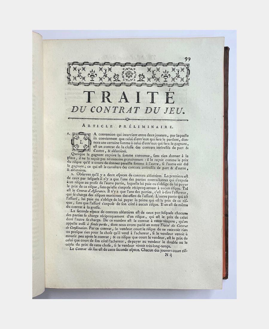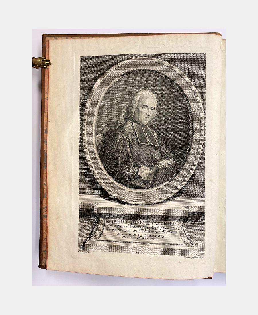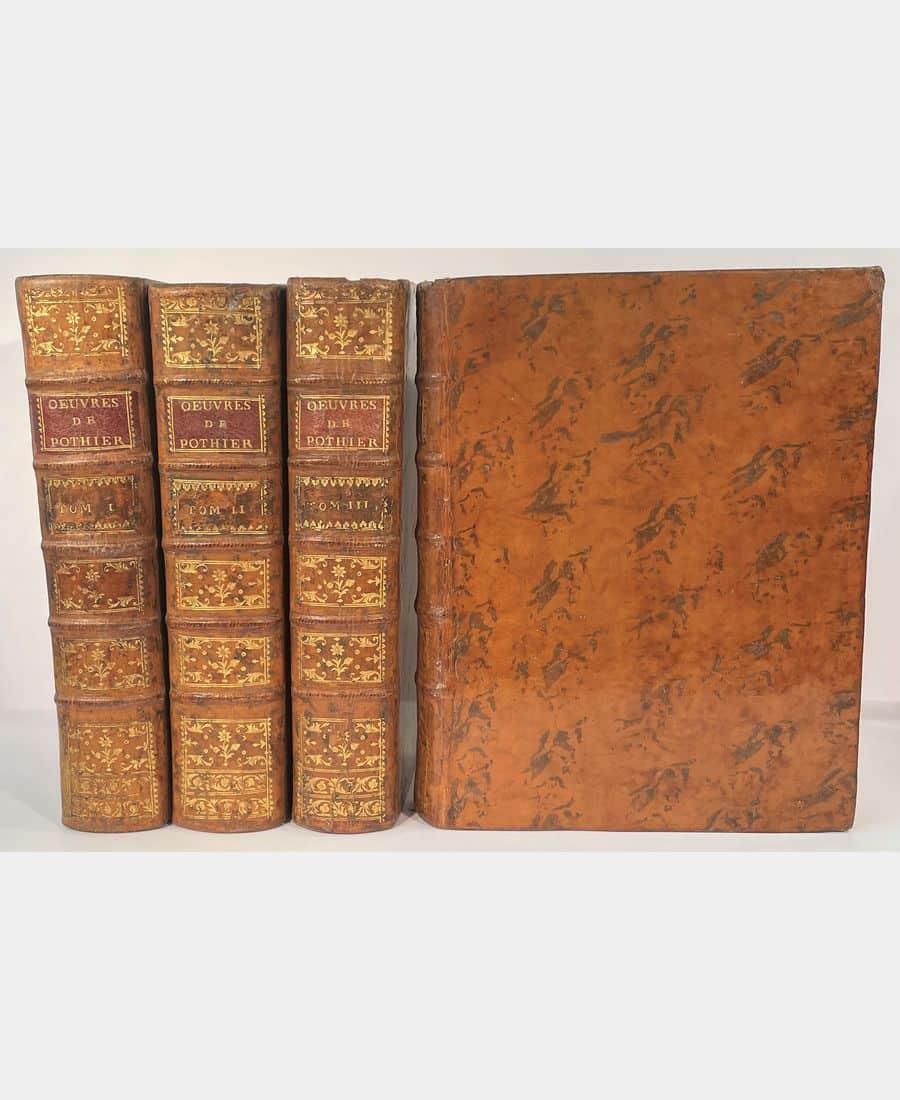 Paris et Orléans, Chez Jean Debure et chez la Veuve Rouzeau-Montaut ; 4 volumes in-4 of LXXXI + 905 + XXVIII + 964 + XXII + 923 + XX + 694 + 136 pp. Contemporary full marbled calf, spine ribbed, decorated with gilt fleurons, title and appendices. Joints skilfully restored. Complete with fronstispiece portrait of Pothier engraved by Vincenzio Vangelisti after Le Noir. A fine set including the Traité des Obligations, the Traité du Contrat de Vente and the Traité des Retraits.