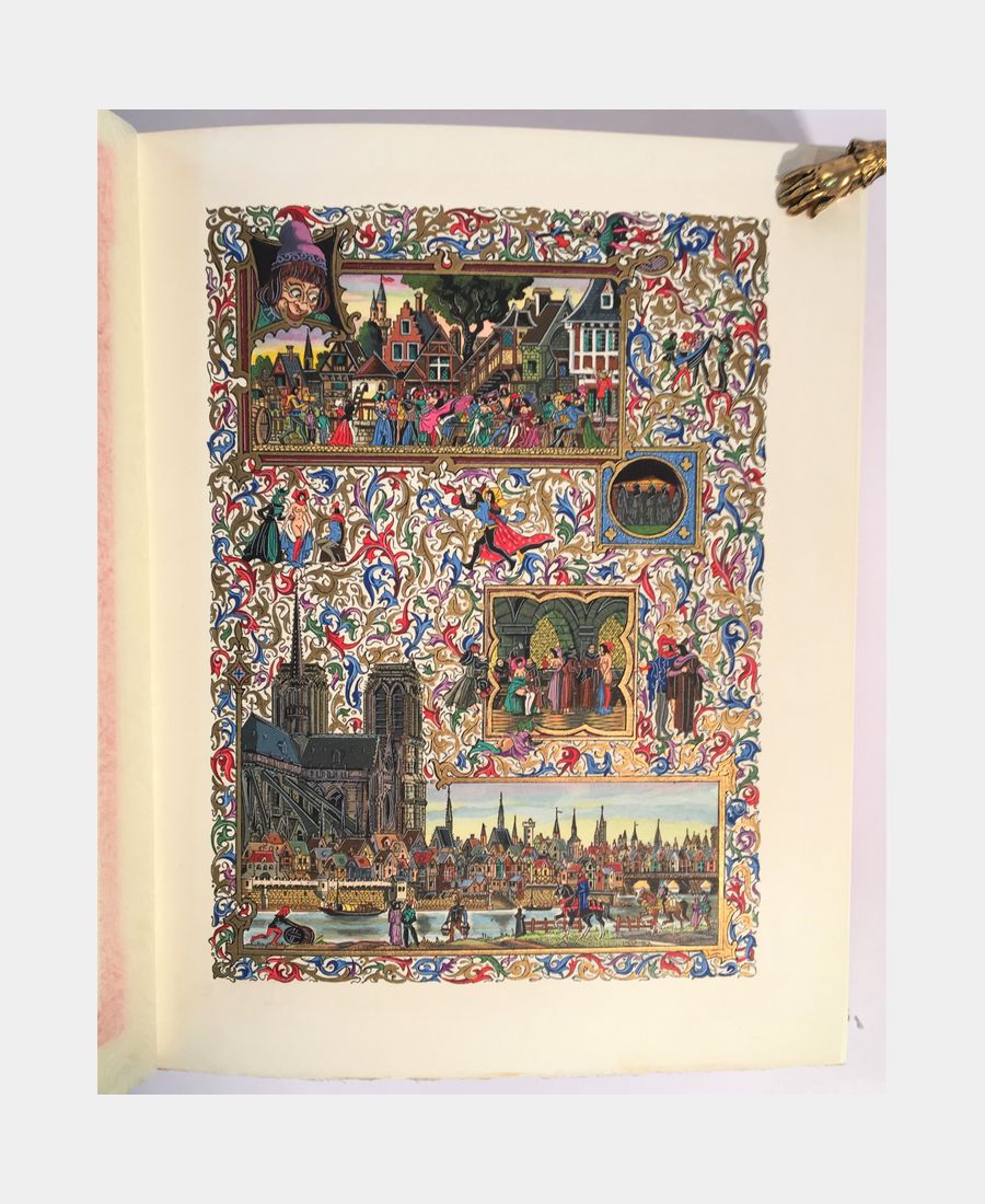 Nice, Editions d’Art Sefer, 1976 – 78; 5 volumes in-4 with 263, 236, 177, 222 and 216 pages. Full morocco leather, ornate ribbed spine, gilt title and tomaison, spines and boards decorated with gilt and cold-stamped medieval motifs; gilt heads, edged slipcases. The spine of volume 1 is only slightly lighter, a few traces of rubbing to the spines, otherwise a very fine copy. Limited edition of 2,500 numbered copies on Lana vellum, one of 1808 of the definitive state, dedicated by the artist. Beautiful miniature illustrations by Jean Gradassi.