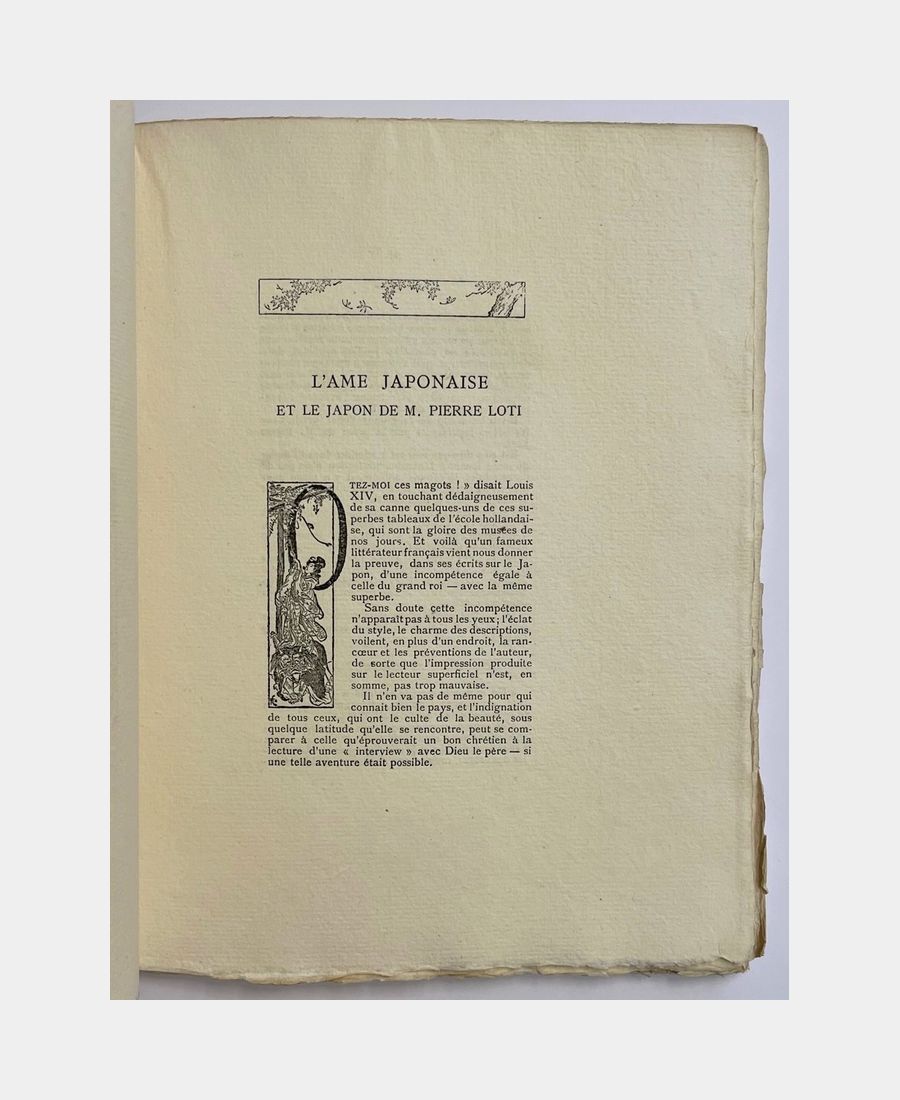 Paris, Bibliothèque artistique et littéraire, 1894; in-8 paperback, 49 pages. Filled cover printed and embossed with chrysanthemums. Very slight foxing and soiling to cover. First edition, one of 330 copies on papier à la forme, imitation hollande. Frontispiece, lettering and vignettes by the author. A fine copy.