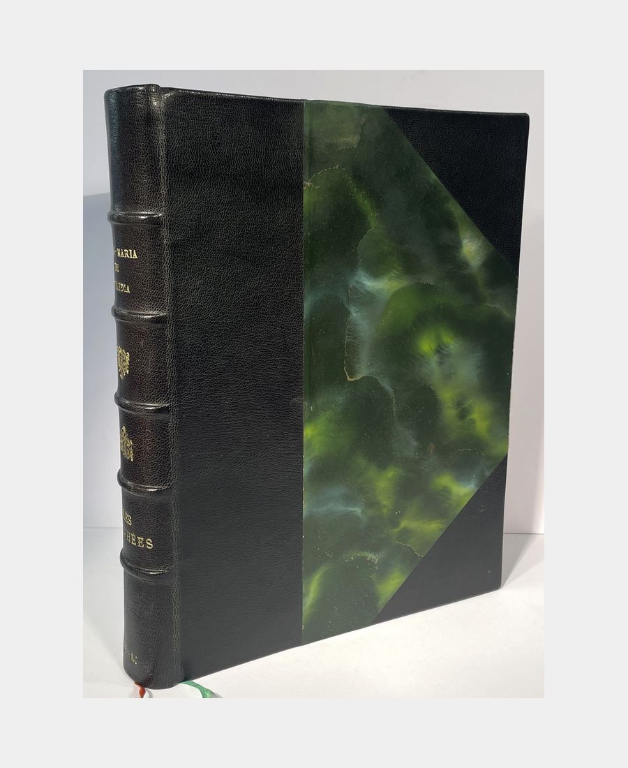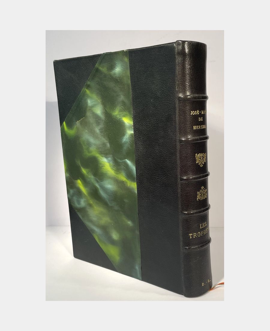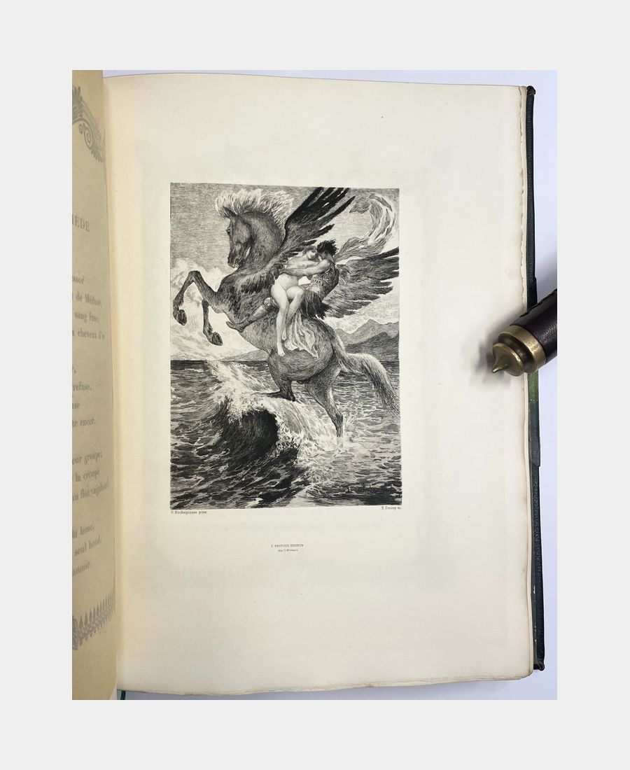 Paris, A. Ferroud, F. Ferroud succ., 1914 ; in folio de (4) ff. + 239 pp. + (1). Demi-chagrin noir à coins, dos à nerfs orné de fleurons, auteur et titre dorés, initiales D.L. en queue. Quelques frottements à la reliure, légères oxydations, deux pliures page 87. Les couvertures illustrées et le dos sont conservés. Exemplaire numéroté sur vélin teinté d’Arches, n°171 sur 330. Edition illustrée de 33 compositions de Georges Rochegrosse gravées à l’eau-forte par Eugène Decisy, les hors-texte sont sous serpente et le texte est encadré d’ornements en noir. Cette édition contient quatre sonnets inédits.