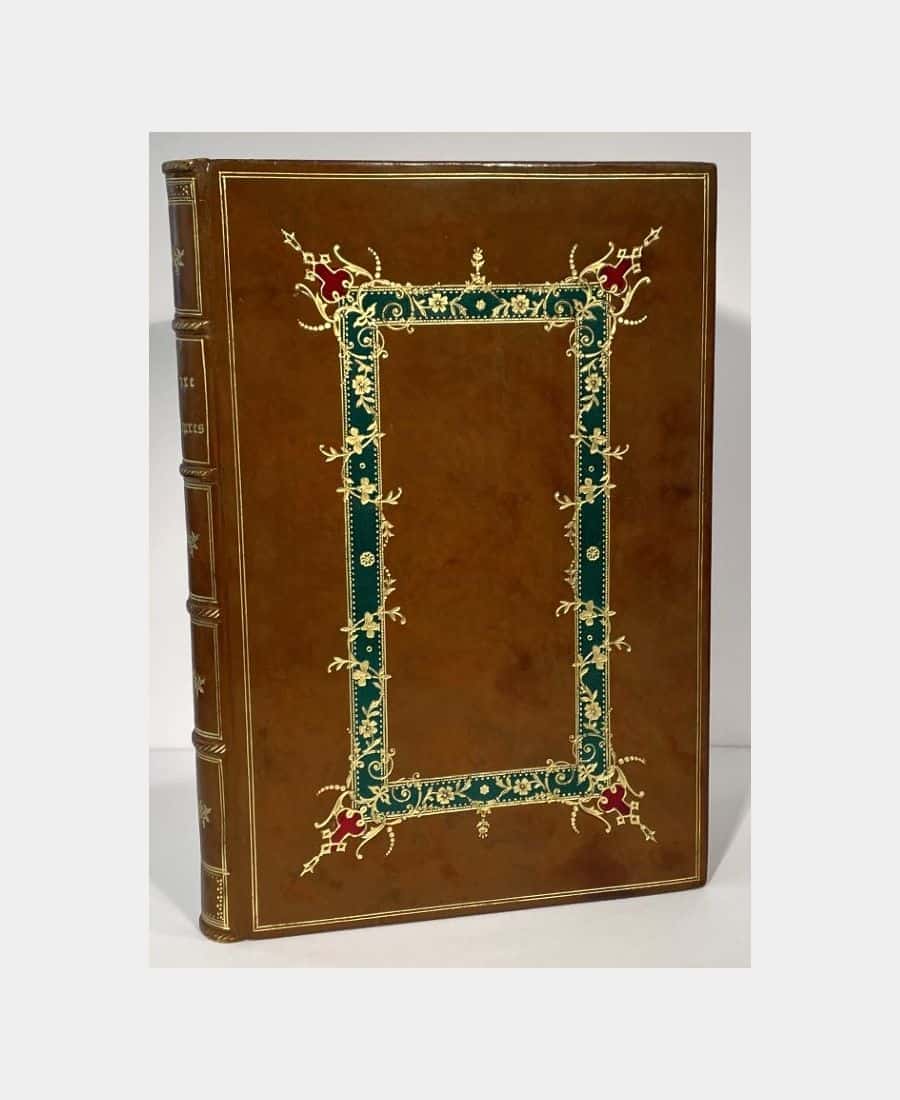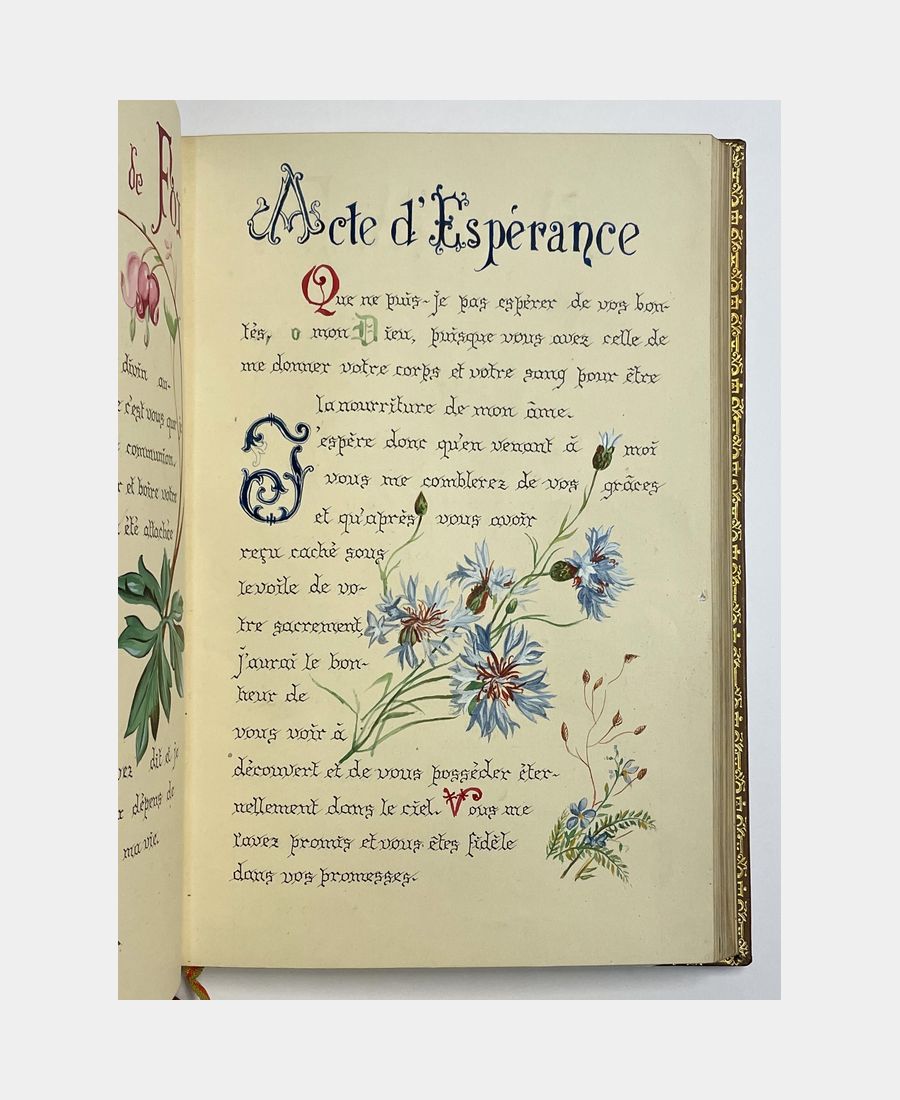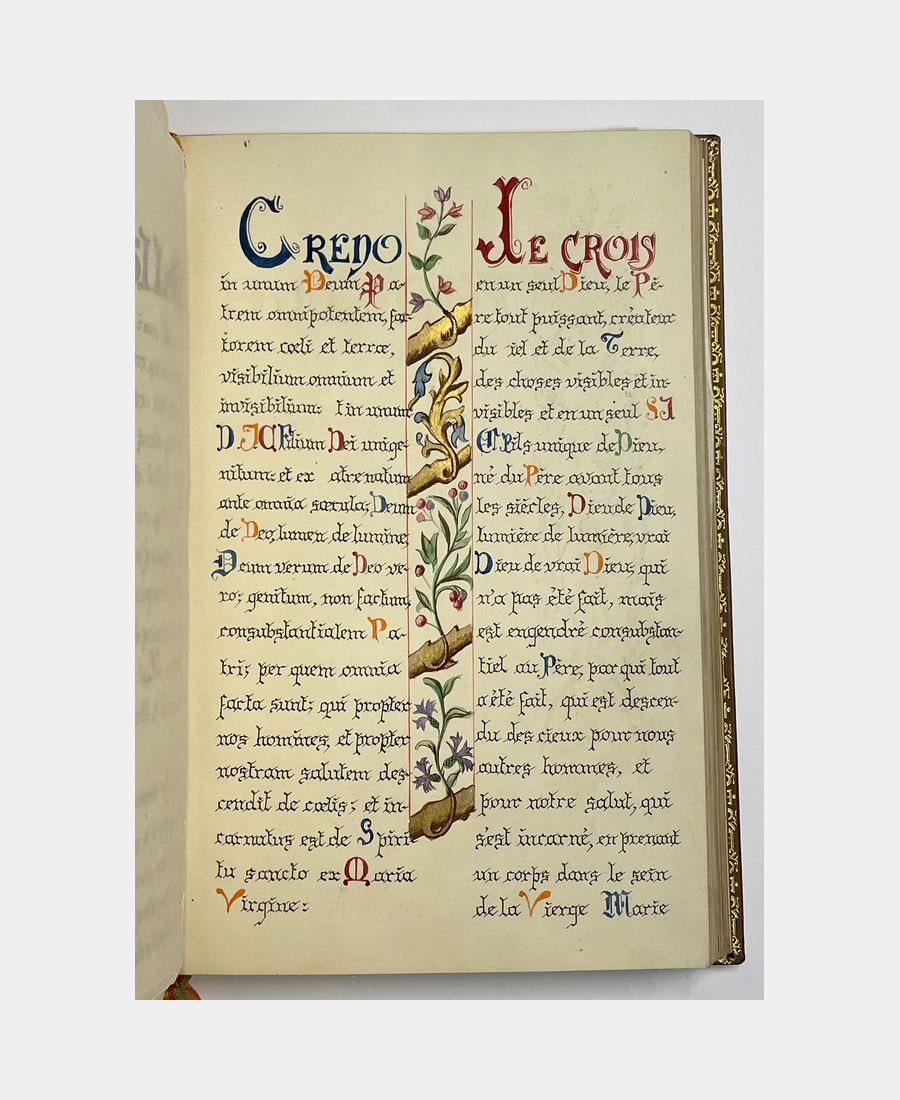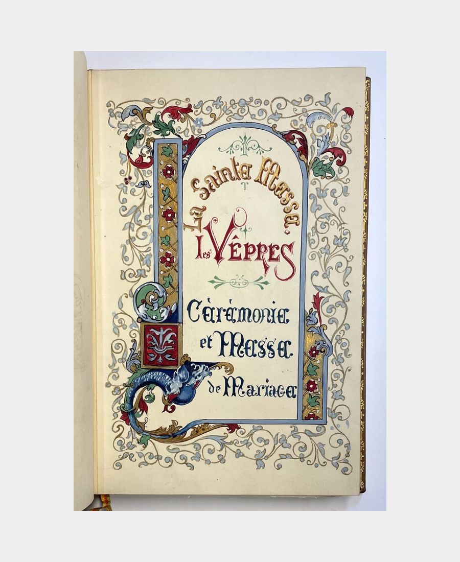 Book of hours. No author, no place, no date. Manuscript circa 1900; in-8, 56 pp. Full glazed calf, spine ribbed, gilt title, gilt boxes decorated with fleurons, boards decorated with mosaic frames of gilt leather and floral motifs, gilt roulette on the edges, inner roulette, gilt edges. Signed binding. Slight rubbing to boards, but overall a very fine copy. Entirely handwritten and illuminated Book of Hours, including Holy Mass, Sunday Vespers and Wedding Ceremony and Mass. Richly illuminated in color, gold and silver.