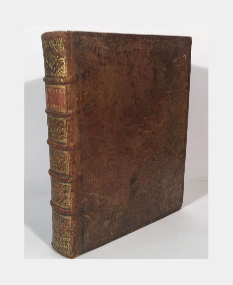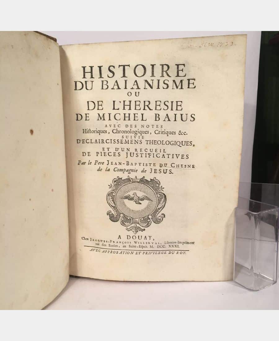 Douay, Jacques-François Willerval, 1731; 3 parts in an in-4 volume (252x198mm), 6 f.n.ch., 450 pp., 1 f.n.ch., 76 pp., 1 f.n.ch., 82 pp., 4 f.n.ch.. Contemporary full calf, ornate ribbed spine, orange title-piece, triple cold-stamped fillets framing the boards, gilt roulette on the edges and headpieces, porphyry edges. Epidermures on the boards, rubbing on the hinges, one sheet of 4 pages out of order: 4 leaves of the Eclarcissement sur l’Histoire du Baianisme (p.9 – 16) bound with the Histoire du Baianisme (between pages 448 and 449) but book quite complete. First edition in French and Latin of this history of Baianism, a doctrine developed by Michel de Bay dit Baïus (1513-1589), a theologian at the University of Louvain who was condemned as a heresy by Pius IV in 1567. A fine copy.