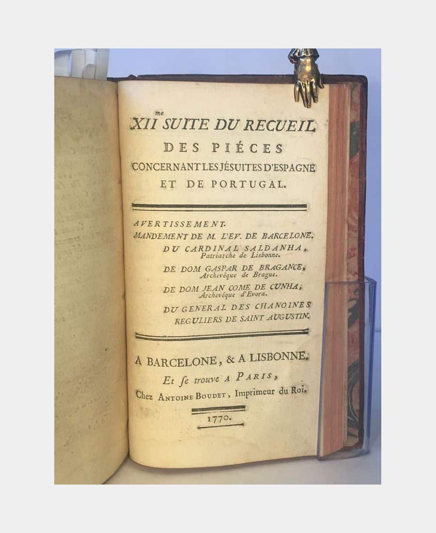 Collection of 10 pieces concerning the Jesuits. BREF DE N. S. P. LE PAPE CLEMENT XIV, En date du XXI Juillet 1773, Portant Suppression de l’Ordre régulier dit SOCIETE DE JESUS. Followed by : AFFAIRES PRESENTES DU PARLEMENT D’AIX, CONCERNANT LES JESUITES. Followed by: MOTIFS DES ARRETS ET ARRETES DU Parlement de Provence des 5, 19 et 30 Juin, 2, 4, 6 et 7 Octobre, concernant l’affaire des soi-disant Jésuites. Followed by : ARREST DE LA COUR DU PARLEMENT, DE PROVENCE. May 30, 1767. Aix, chez la veuve de J. David et E. David, 1767. Followed by : ARRET DU PARLEMENT DE TOULOUSE (…) du 16 février 1763. A Toulouse, chez la Veuve Lecamus. Followed by: DISCOURS, ARRETES ET ARRET DU PARLEMENT DE NORMANDIE, Concernant les ci-devant soi-disans Jésuites. May 14 & 19, 1767. Près la Rougemare, de l’imprimerie de Richard Lallemant, 1767 Suivi de : EXTRAIT des Registres des Délibérations de la Cour Souveraine de Lorraine et Barrois. August 5, 1766. Followed by : LA FRANCE AU PARLEMENT. POET. Followed by : ADVIS SECRETS DE LA SOCIETE DE JESUS. A Paderborn (Paris), 1661. Followed by: XIIme SUITE DU RECUEIL DES PIECES CONCERNANT LES JESUITES D’ESPAGNE ET DE PORTUGAL. A Barcelone et à Lisbonne, Paris, Antoine Boudet, 1770. In-12 (169x103mm), 69 pp. and 1 f.n.ch., 18 pp. and 1 f.n.ch., 77 pp. and 23 pp. and 1 f.n.ch., 20 pp. and 44 pp and 33 pp. and 47 pp. and 71 pp. and 104 pp. Contemporary full marbled calf, smooth spine titled and decorated. Lower corners slightly dulled, marginal stains on about 30 pages.