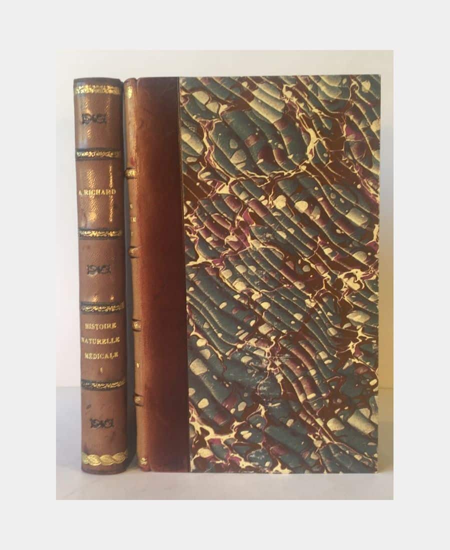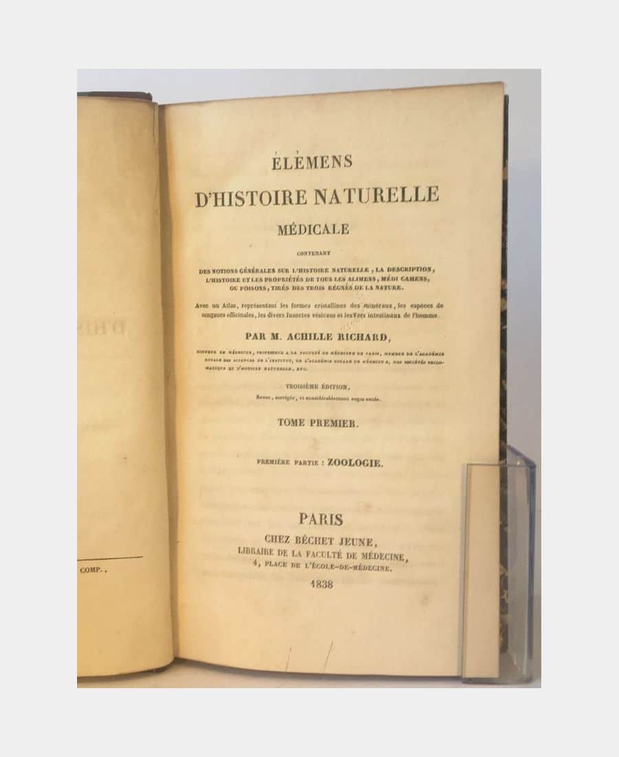 Paris, Béchet Jeune, 1838; two volumes In-8 (214x137mm), XIX, 415 pp., 8 pl. and XXIV, 328 pp, 2 pl.. Demi-basane, titled ribbed spine, tomé with mention of the author, iron and cold decoration. Volume 1 on zoology and volume 2 on mineralogy complete with plates (5 colored). Volume 3 on botany missing. Spines sunned, slight foxing, marginal tear on p. 259 of volume 1 with no missing text.