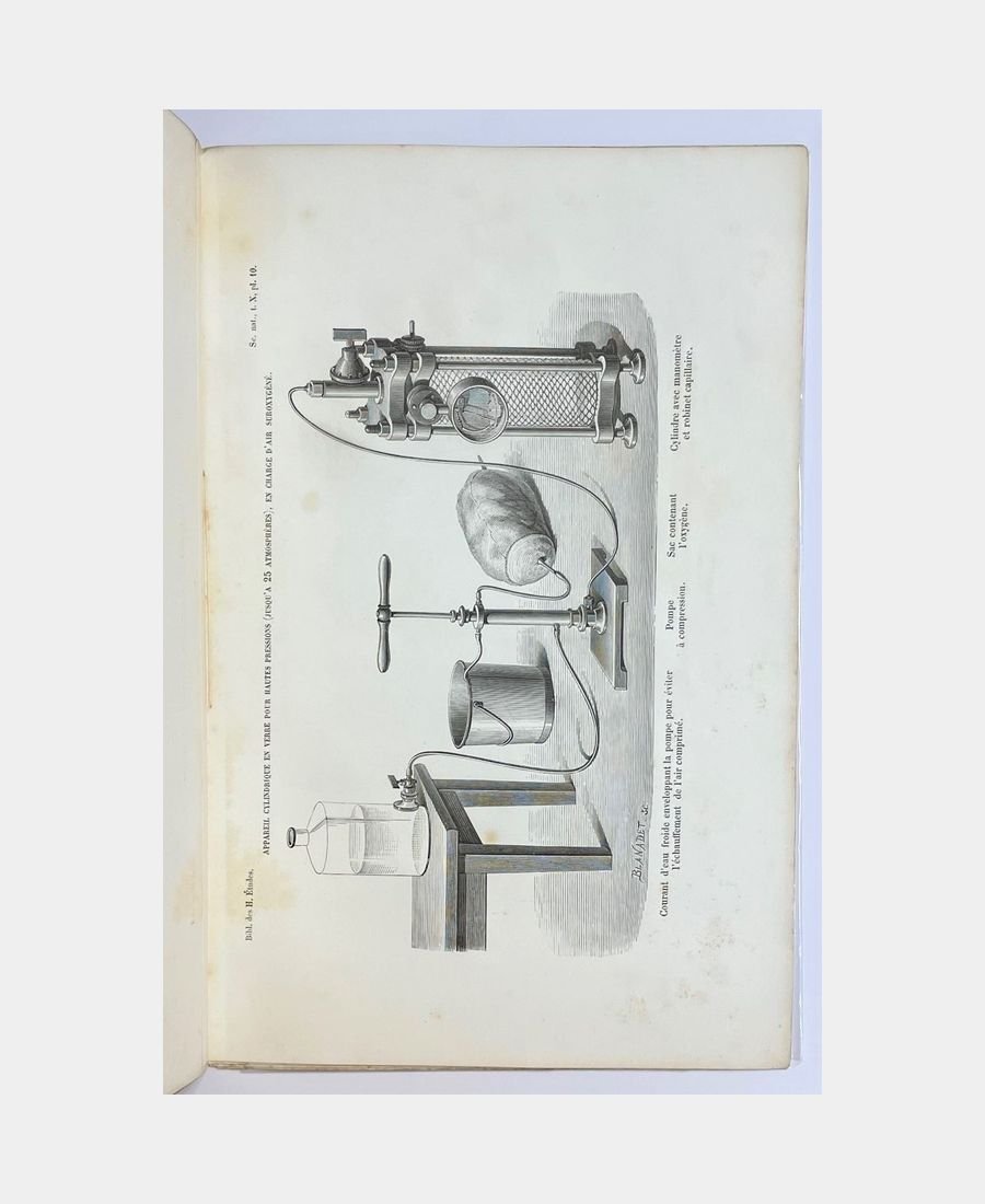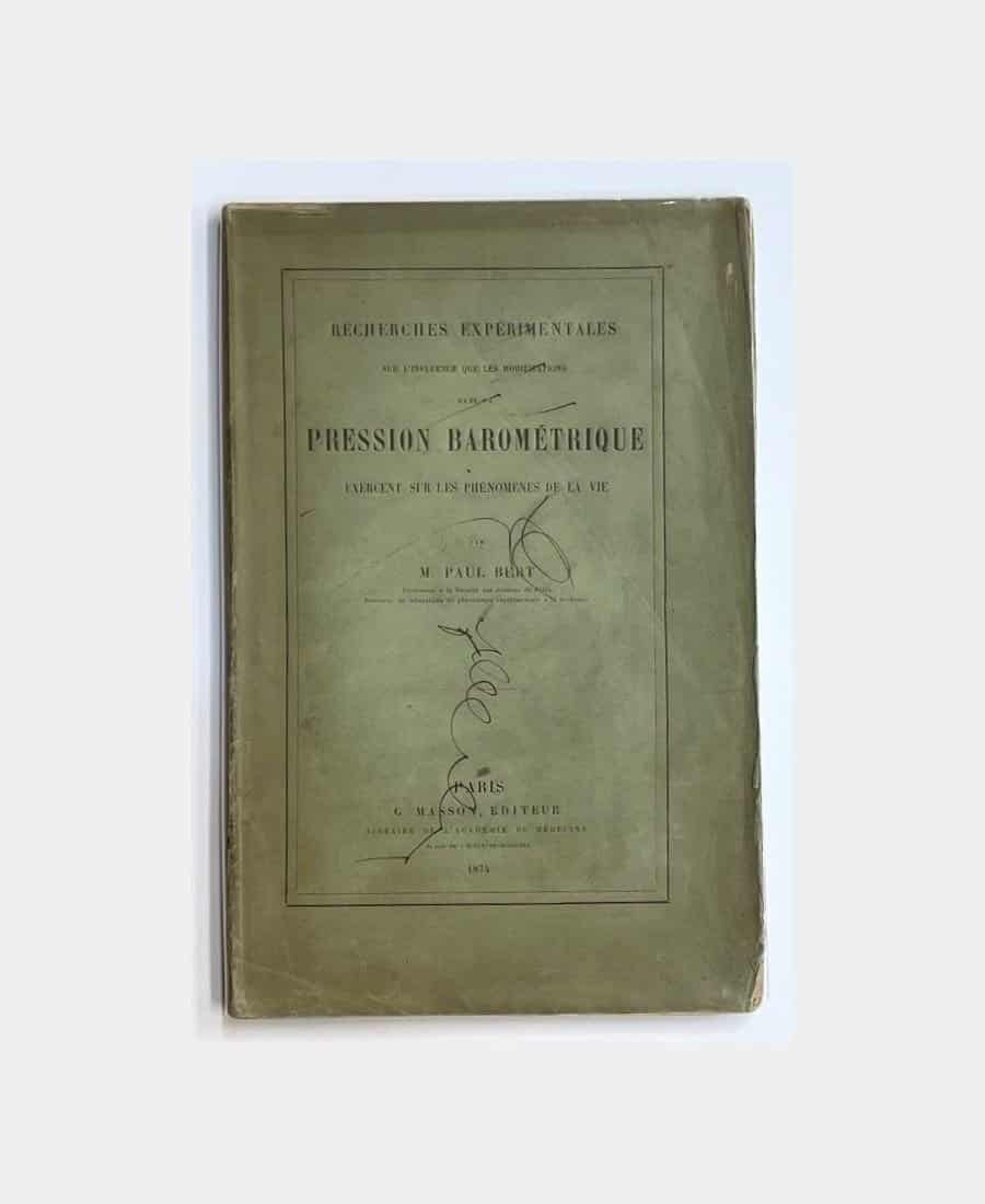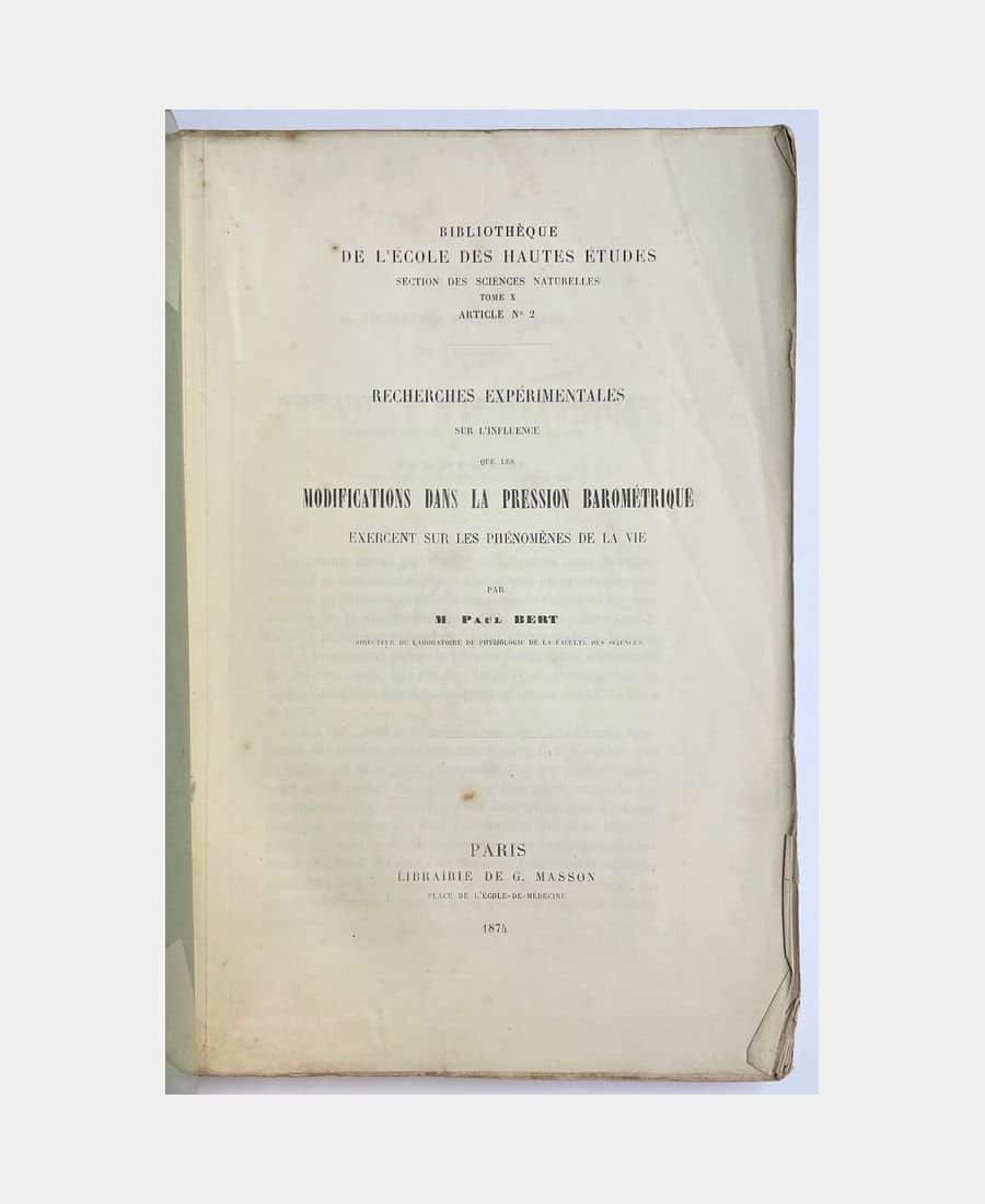 Paris, G. Masson, 1874; in-8 paperback with 167 pages and 6 plates in-fine, printed cover. Penciled erasures on cover, creases on first pages, fragile spine and scattered foxing. A collection of notes presented to the Académie des Sciences from 1871 to 1873, reprinted in 1878 in his work “La Pression barométrique : recherches de physiologie expérimentale”.