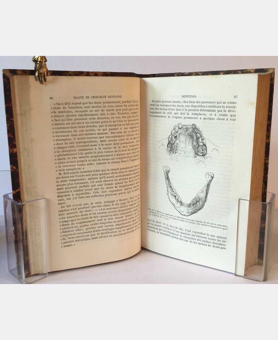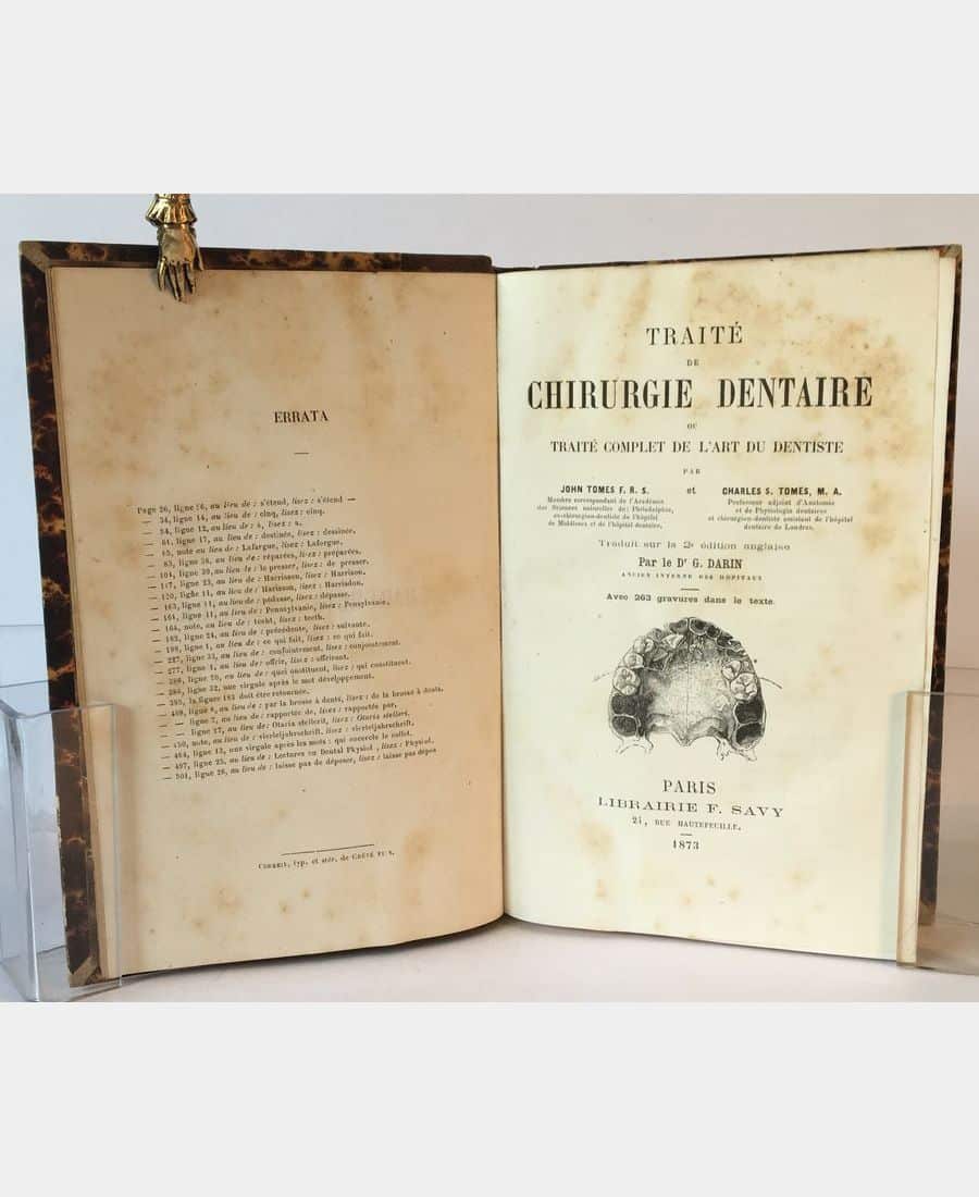 Paris, Librairie F. Savy, 1873. In-8 (200x135mm), 688 pp. Brown half-chagrin, 5-ribbed spine. Traité de chirurgie dentaire or complete treatise on the art of dentistry. First French edition, translated from the second English edition by Dr. G. Darin, a former hospital intern. 263 woodcuts in the text. Scattered foxing, most concentrated on the false title and title page, otherwise a good copy.