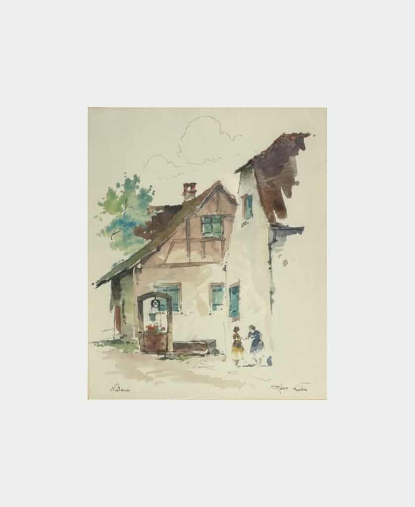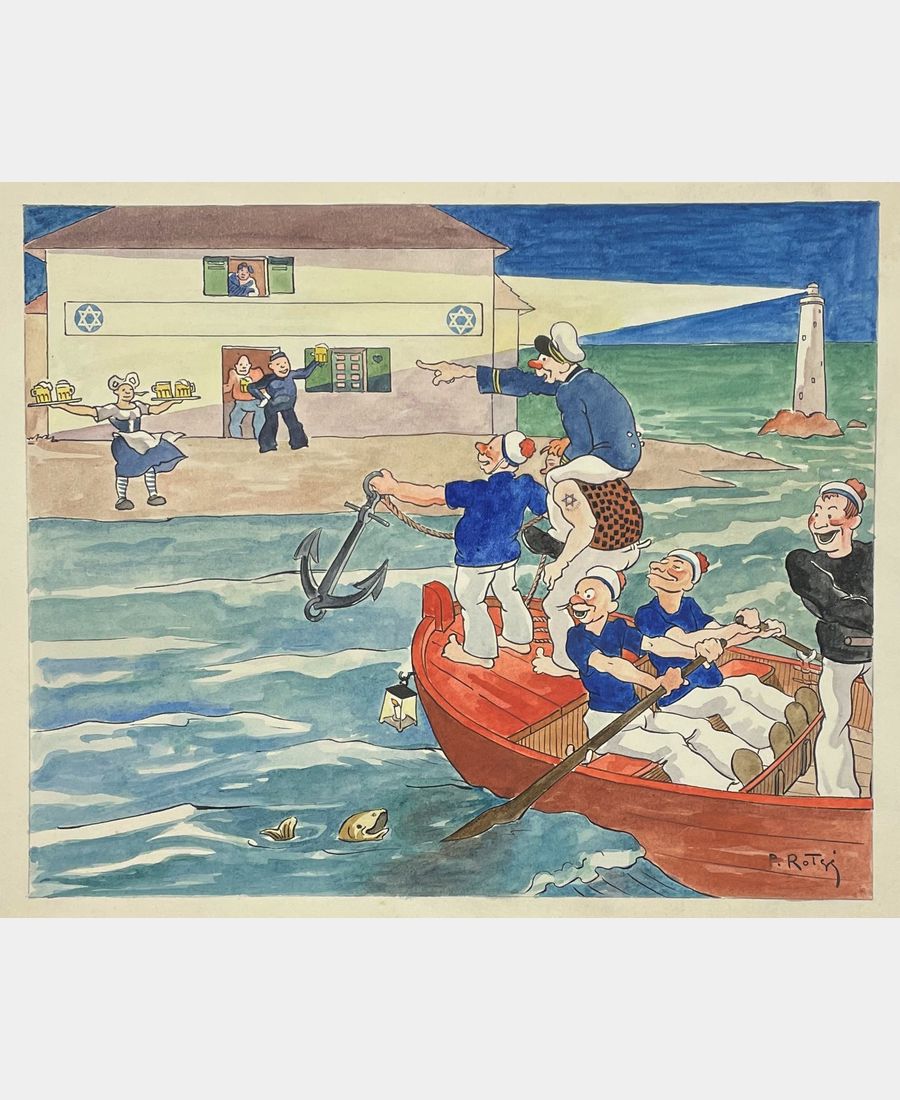 Sailors arriving in port. Prosper Rotgé (Caen, 1895 – 1969). Original watercolor on velin paper. Signed lower right. Size of motif: 260 x 190 mm. Sheet size: 319 x 240 mm. Marginal brown spots. Beautiful watercolor in vivid colors.
