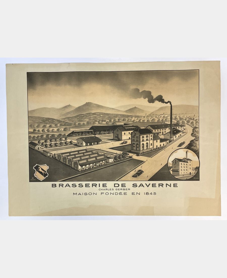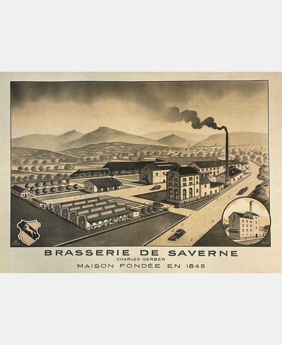 [Brasserie] Brasserie de Saverne Charles Gerber Maison fondée en 1845. Affiche lithographique de Klein issue de l’imprimerie lithographique A. Michel à Strasbourg. 1/2 XXème siècle. Pliures et insolations marginales sans incidence sur le motif. Dimension de l’affiche : 54,3 x 67,5 cm. Dimension du sujet : 34,9 x 54,3 cm. Affiche de l’actuelle brasserie La Licorne de Saverne dans les bâtiments de la rue de Dettwiller qu’elle occupe depuis 1911.