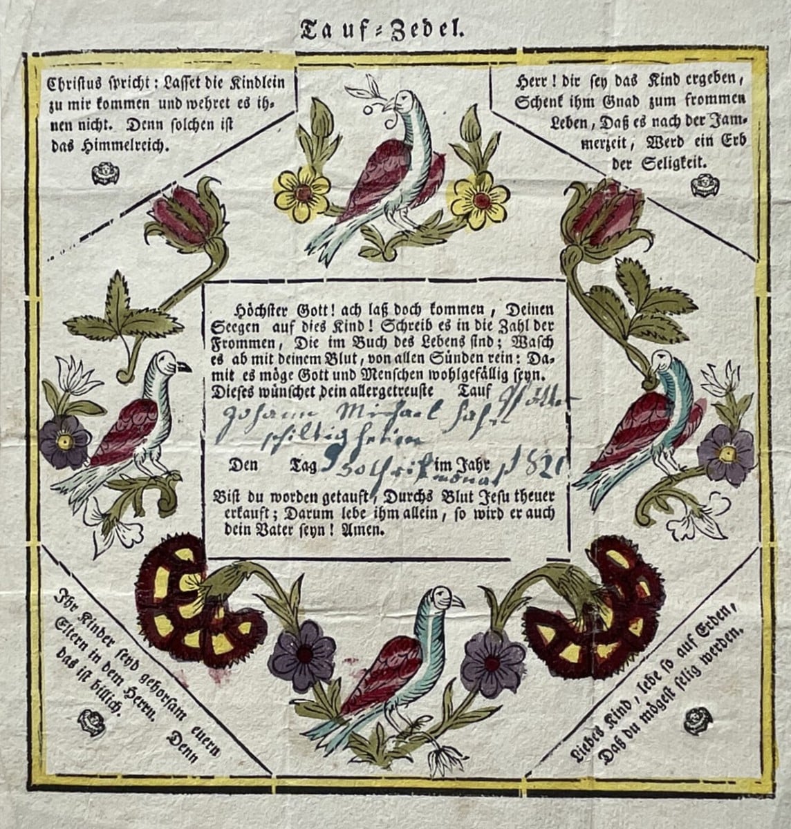 Christening greeting – Tauf-Zedel (Taufzettel) hand-printed and colored at the time. Dated 1821.