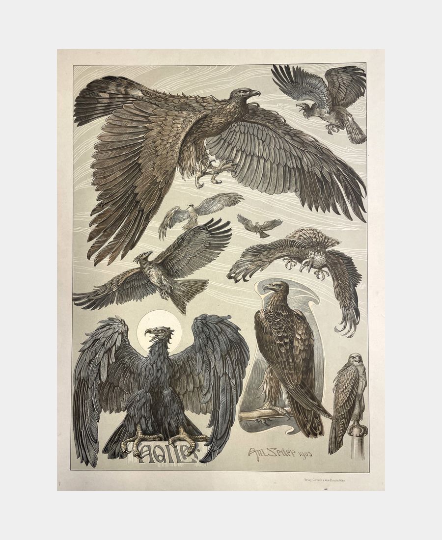Aqila (aigle). Anton Seder. Chromolithographie. 1903. Editée par Gerlach et Wiedling à Vienne. Insolation et petites restaurations marginales. Format du sujet : 39,5 x 28,8 cm. Format du feuillet : 56,6 x 43 cm. Planche 21 issue d’un des portfolios “Das Tier in der Dekorativen Kunst” d’Anton Seder (Munich, 1850 – Strasbourg, 1916), peintre et directeur de l’École des arts décoratifs de Strasbourg (Kunstgewerbeschule) de 1890 à 1915.