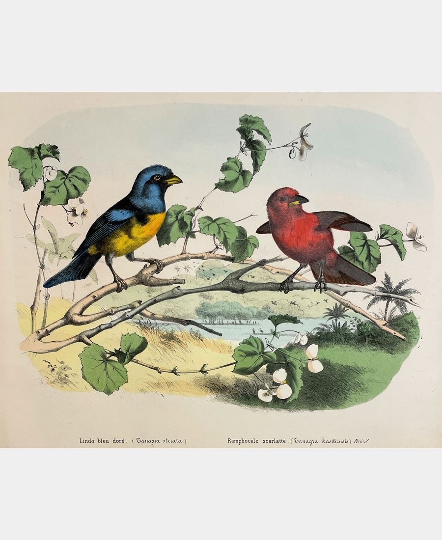 Golden blue lindo (Tanagra striata). Scarlet Ramphocele (Tanagra brasiliensis), Brazil. Lithography. 19th century.