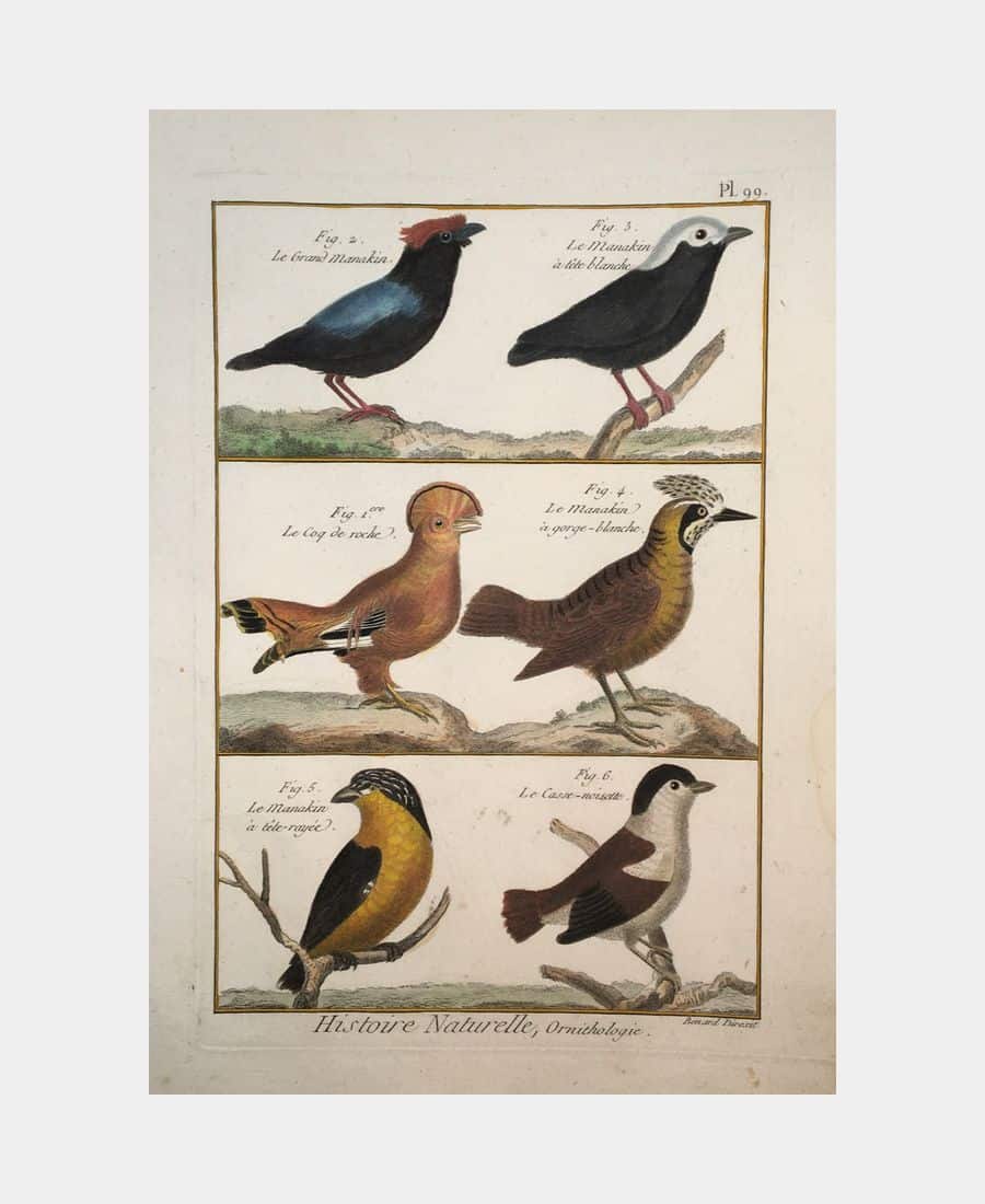 Natural history, Ornithology. The Great Manakin. Diderot and d’Alembert. Copper engraving. 18th century. Hand-colored. Sheet size: 312 x 220 mm. Plate size: 250 x 195 mm. Plate 99 from Diderot and d’Alembert’s Histoire naturelle.