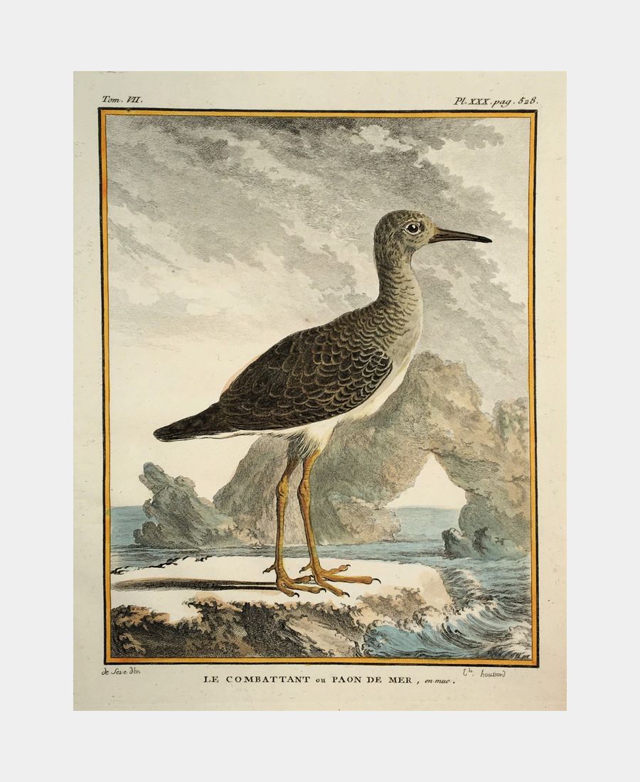 The Combatant or Sea Peacock, moulting. BUFFON (Georges-Louis Leclerc, comte de). Copper engraving. 18th century. Hand-colored. Sheet size: 249 x 180 mm. Plate size: 220 x 174 mm. Plate XXX from Buffon’s Histoire naturelle des oiseaux.