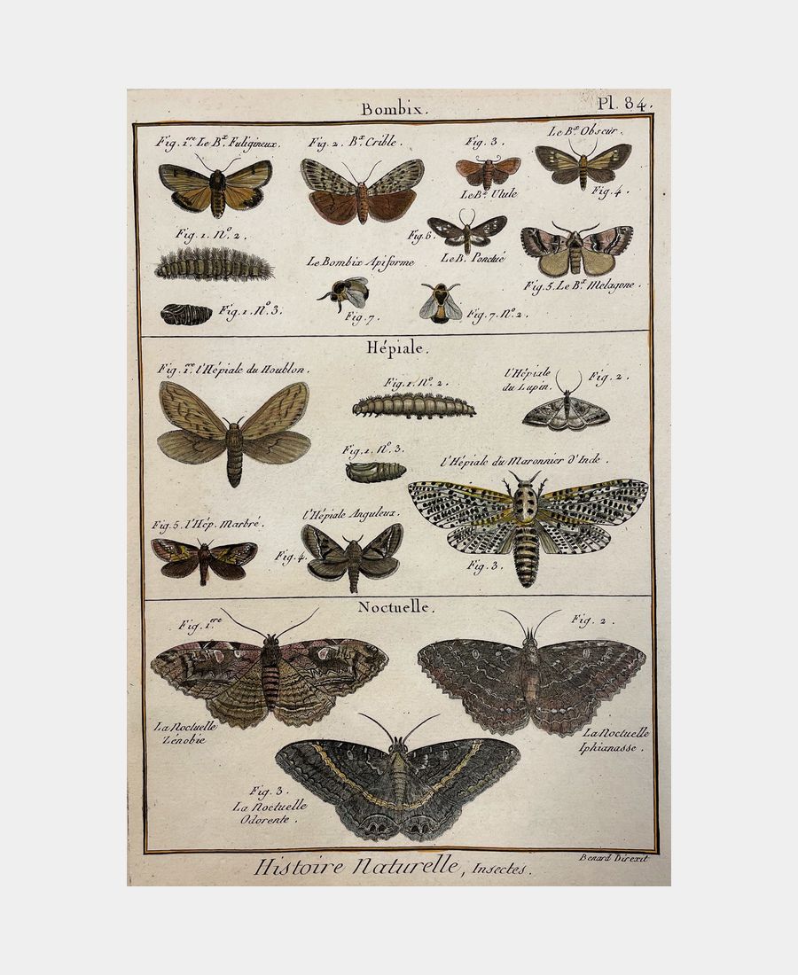 Natural history. Bombix. Hepiale. Noctuelle. Diderot and d’Alembert. Copper engraving. 18th century. Hand-colored. Sheet size: 310 x 216 mm. Plate size: 255 x 198 mm. Plate 84 from Diderot and d’Alembert’s Histoire naturelle.