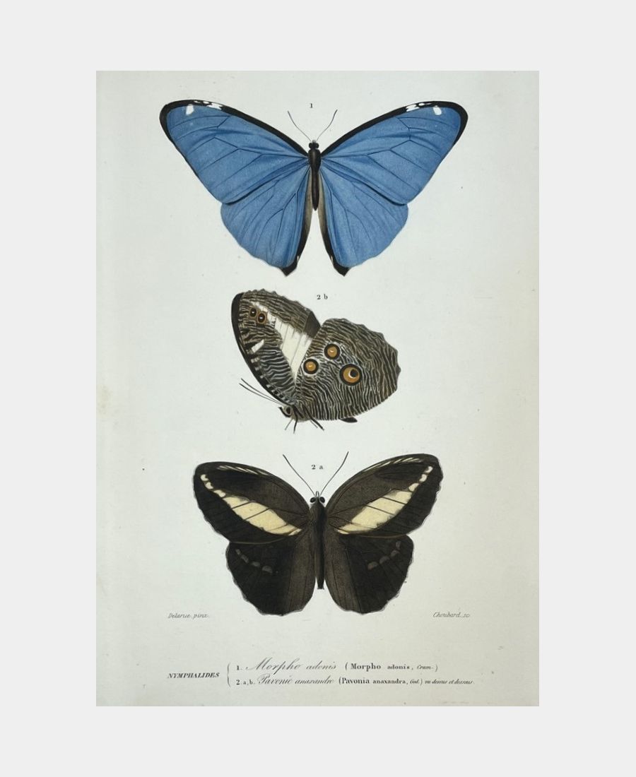 Nymphalids – Morpho adonis – Pavonic anaxandre. Steel engraving by Choubard after Delarue. Nineteenth century. Marginal foxing. Sheet size: 275 x 175 mm. Subject size: 175 x 105 mm. Plate from the Dictionnaire universel d’histoire naturelle published under the direction of Charles d’Orbigny.