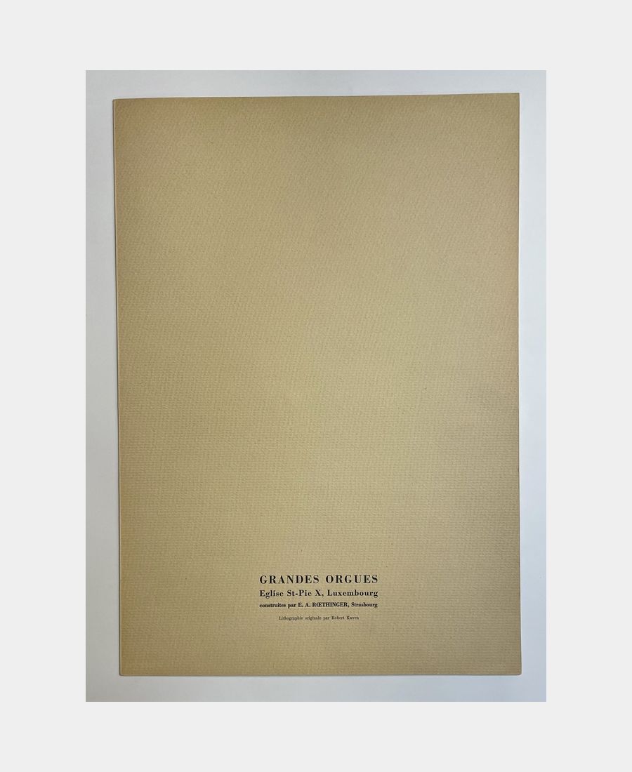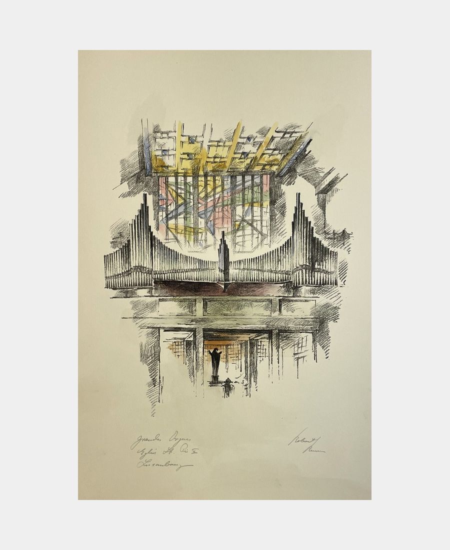 Grandes Orgues de l’église Saint-Pie, Luxembourg, built by E. A. Roethinger – Strasbourg. Robert Kuven (Strasbourg, 1901 – 1983, Strasbourg). Original watercolor lithograph, signed. Sheet size: 405 x 270 mm. Fine proof in printed folder.