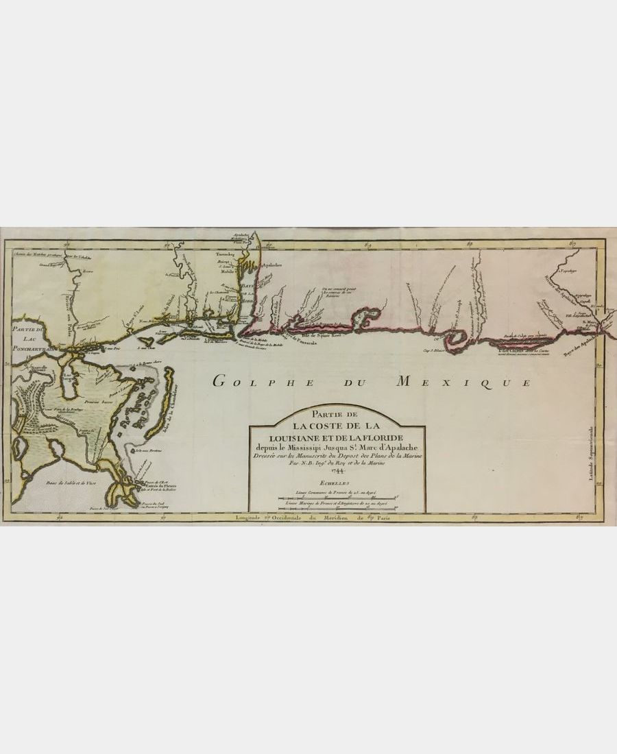PARTIE DE LA COSTE DE LA LOUISIANE ET DE LA FLORIDE depuis le Mississipi jusqua St. Marc d’Apalache Dressée sur les Manuscrits du Depost des Plans de la Marine Jacques-Nicolas Bellin (1703, Paris – 1772, Versailles) 1744 Copper engraving Sheet size: 232 x 465 mm Board size: 225 x 442 mm Hand-colored. Fine condition.