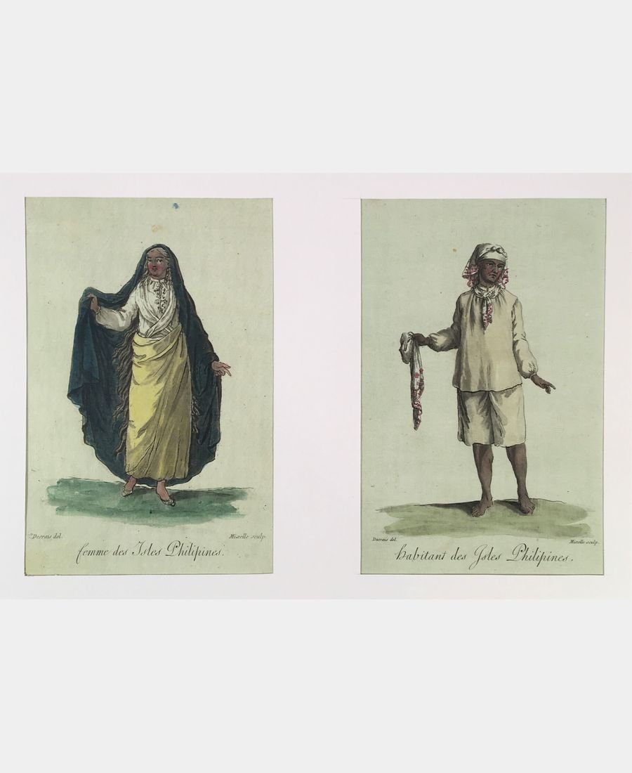 Woman from Isles Philipines. Inhabitant of the Isles Philipines. Two aquatints by Mixelle after Desrais. 1787. Proofs on blue laid paper. Vintage handcolors. Sheet size: 195 x 147 mm. Plate dimensions: 171 x 114 mm. Minor foxing.