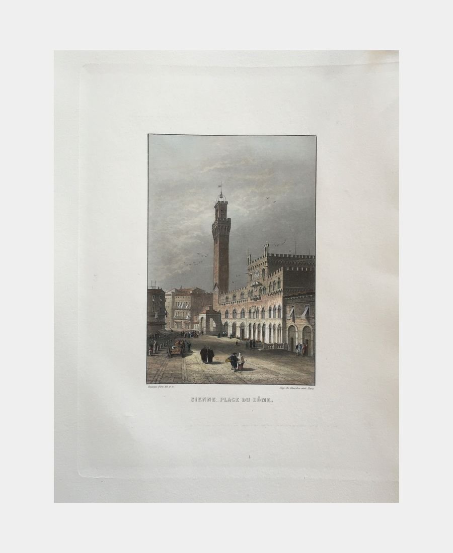 Siena – Duomo Square. Original etching by the Rouargue brothers. 19th century. Proof on wove paper, printed by Ch. Chardon aîné in Paris. Hand-colored. Sheet size: 382 x 266 mm. Board size: 279 x 233 mm. A fine print.