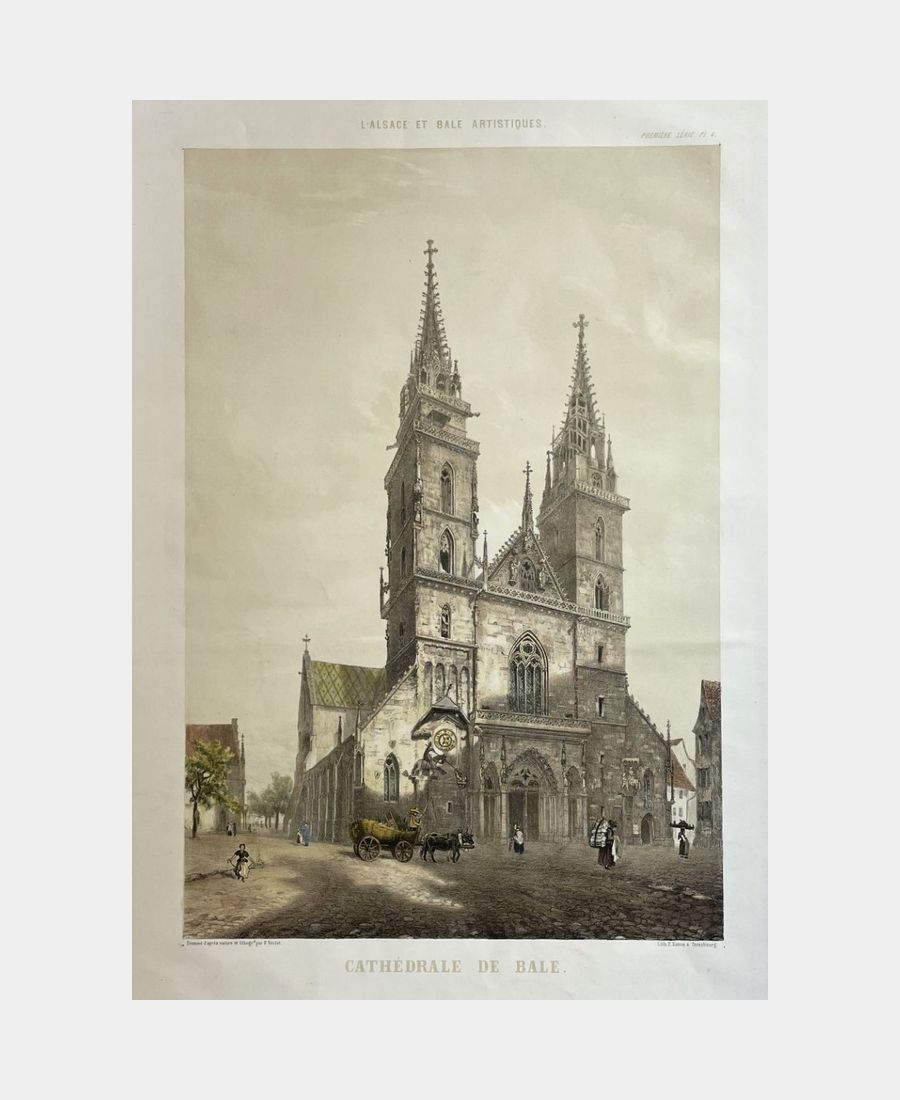 Basel Cathedral. Drawn from life and lithographed by Félix Henri Voulot. Circa 1850. Hand-enhanced three-tone proof on wove paper published by Simon in Strasbourg. From the series L’Alsace et Bâle artistiques. Sheet size: 559 x 383 mm. Subject size: 391 x 265 mm. Félix Henri Voulot (1828, Belfort – 1899, Epinal) was a draftsman, painter and lithographer. He was curator of the Musée d’Epinal from 1878 and was the father of sculptor Louis Joseph Félix Voulot.
