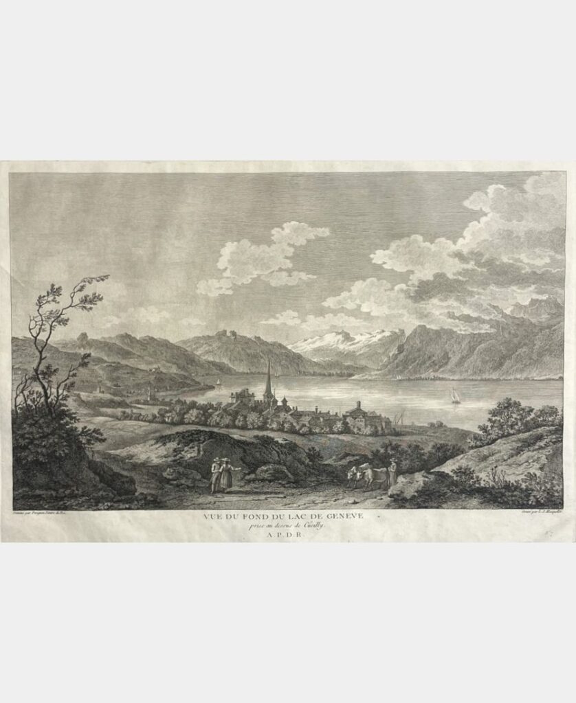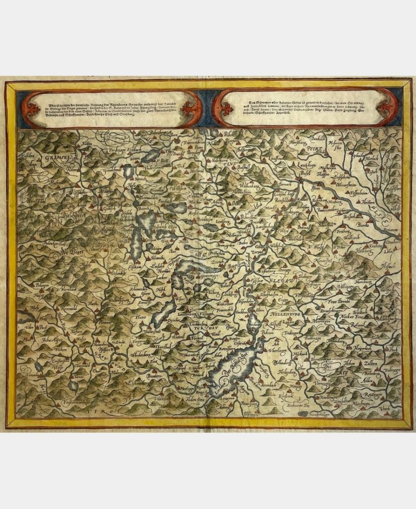 Contrafactur der Statt Zürich Anno 1595. Gravure sur bois de Ludwig Fryg et Christoph Murer. XVIe siècle. Coloris main. Dimension du feuillet : 310 x 406 mm ; Dimension du sujet : 184 x 390 mm. Carte issue de la Cosmographie de Sebastian Munster.