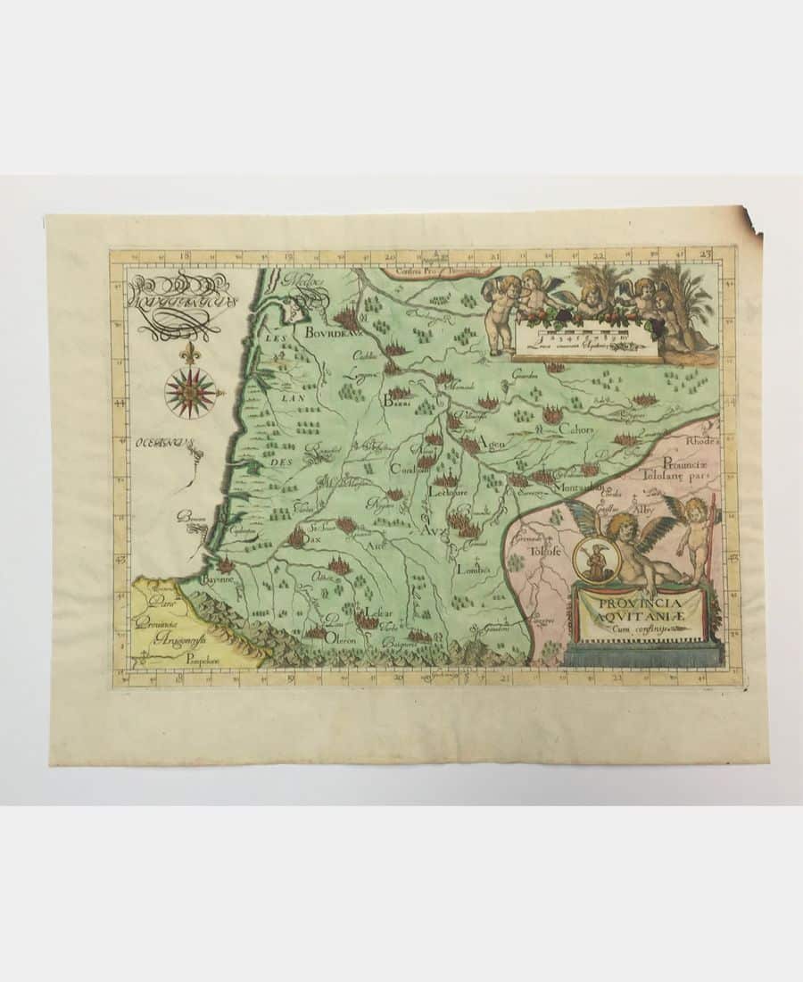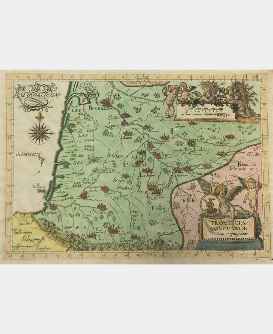 Provincia Aquitaniae. Giovanni Montecalerio. 1654. Published in Rome. Copper engraving. Hand-colored. Sheet size: 186 x 292 mm Board size: 135 x 175 mm. Upper right corner missing, with no effect on the design. Rare Italian map from the Capuchin Atlas.
