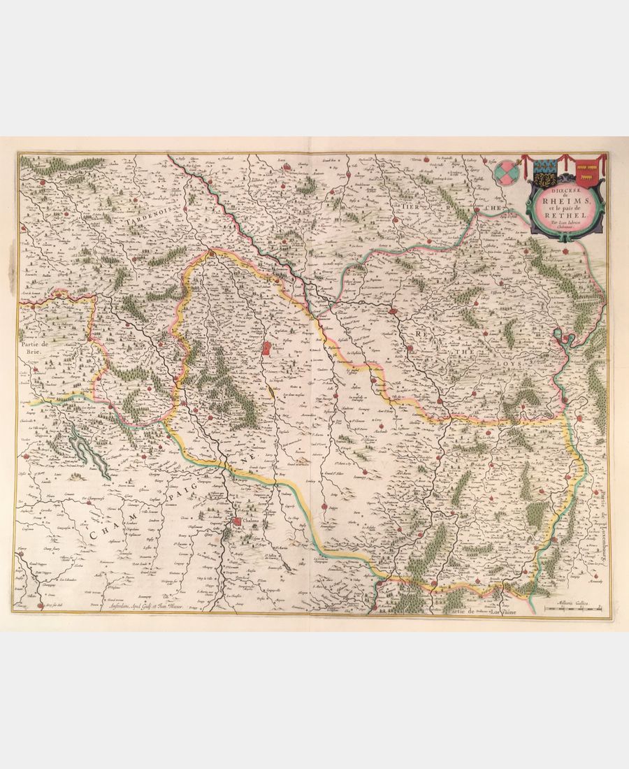 Diocese of Rheims and the country of Rethel. Joan Blaeu (1596 – 1673). 1663. Copper engraving. Vintage hand-colored. Sheet size: 529 x 637 mm. Board size : 107 x 525 mm. Center fold, explanatory text in Latin on verso. Small stain in the left margin, with no effect on the design.