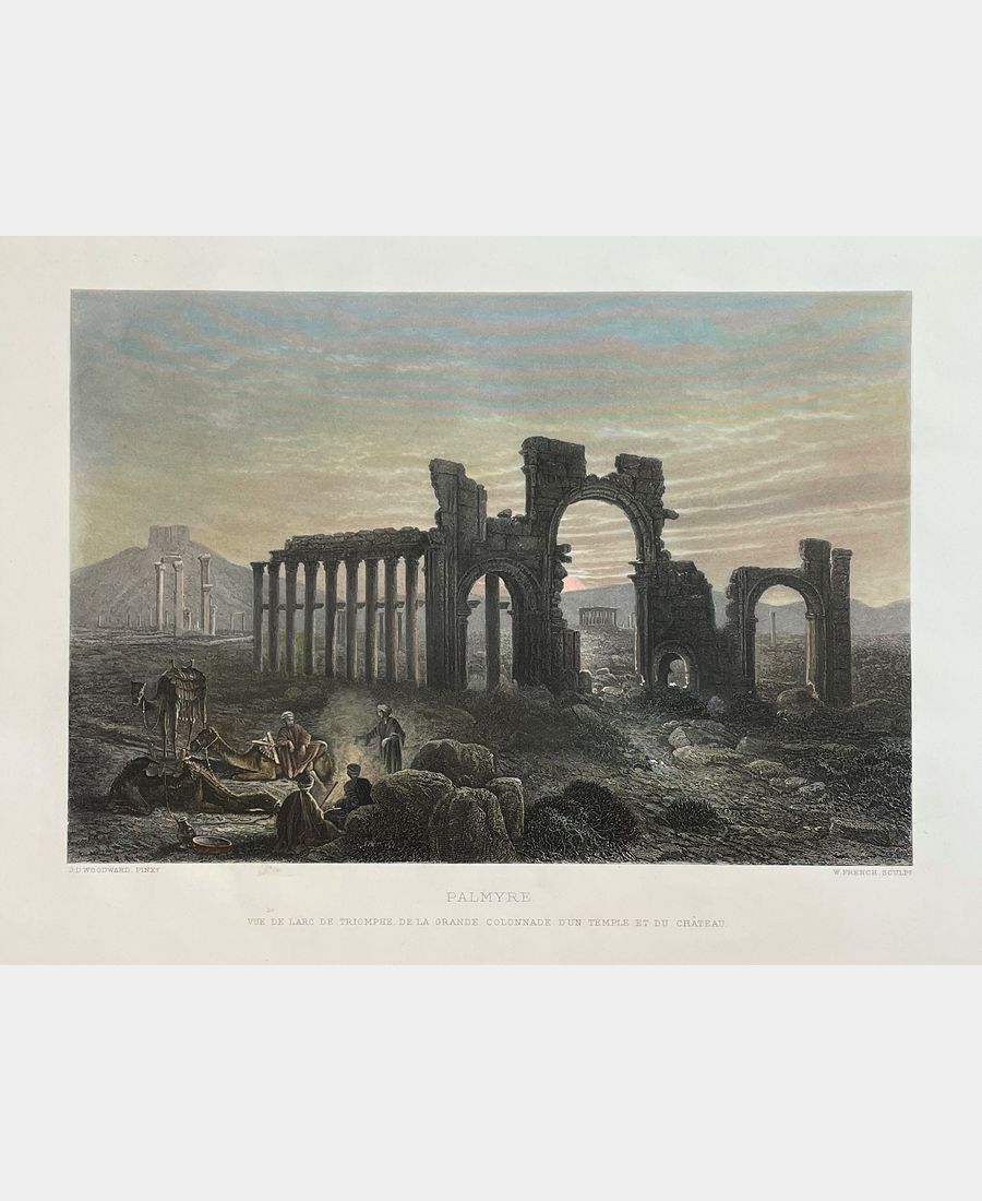 Palmyra. View of the triumphal arch, the great colonnade, a temple and the castle. Etching by William French after John Woodward. 1884. Hand-colored. Proof on vellum printed by Plon. Sheet size: 275 x 389 mm. Plate size: 244 x 314 mm. John D. Woodward (1846 – 1924) is renowned for his numerous landscape paintings of the United States, Europe and the Middle East.