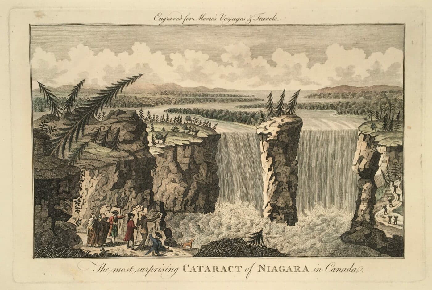 The Most surprising cataract of Niagara in Canada. George Henry Millar. Copper engraving. 18th century. Hand-colored. Sheet size: 235 x 367 mm. Board size: 189 x 288 mm. Fold in lower left corner, three small stains at edge of bowl.