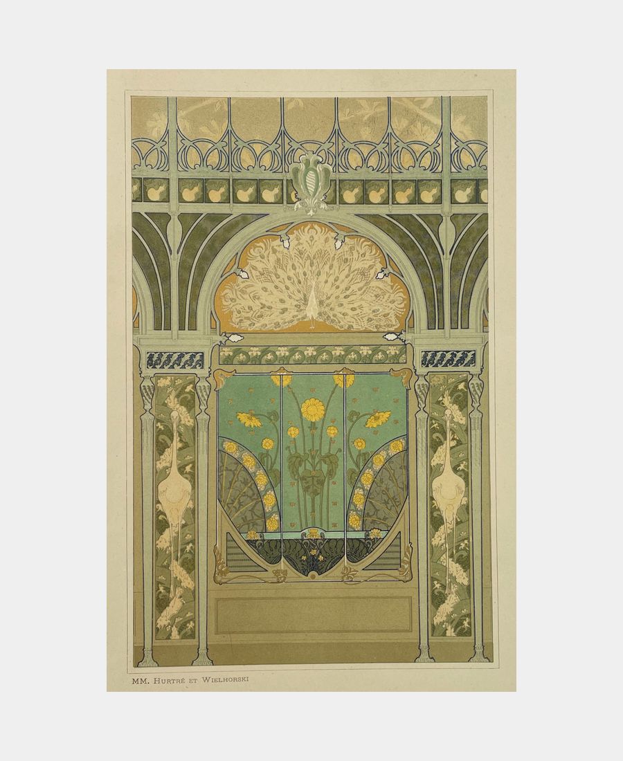 Decoration of a restaurant. Chromolithography.circa 1900. Imprimeries Lemercier, Paris. Design size : 235 x 148 mm. Sheet size : 286 x 193 mm. Plate illustrating the Art Nouveau decorations of the Fermette Marbeuf restaurant in Paris’s 8th arrondissement, by architect Emile Hurtré and ceramist Jules Wielhorski.