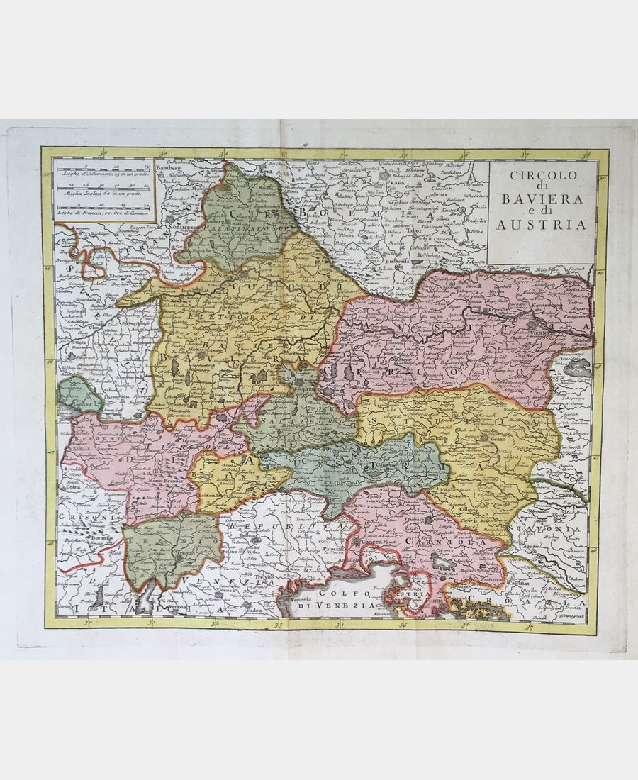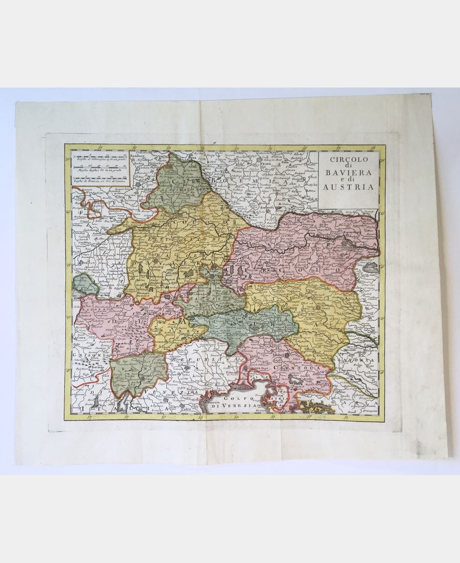 Circolo di Baviera e di Austria. Copper engraving. Hand-colored. Published in 1740 in Venice by de L’Isle. Sheet size: 362 x 430 mm. Board size: 299 x 354 mm.
