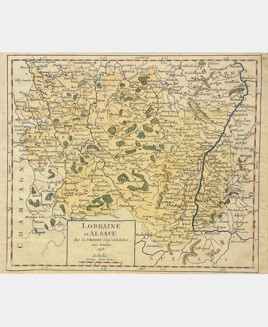 Lorraine and Alsace. Gilles Robert de Vaugondy, ordinary geographer to the King. 1748. Copper engraving. Hand-colored. Sheet size: 229 x 293 mm Board size: 164 x 199 mm. Slightly yellowed leaf, marginal halo, no effect on design.