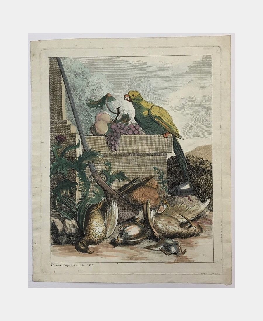 Still life with parrot and woodcock. Copper engraving by Gabriel Huquier (1695-1772). Hand-colored. Sheet size: 257 x 210 mm. Board size: 236 x 188 mm. Some traces of old folds.