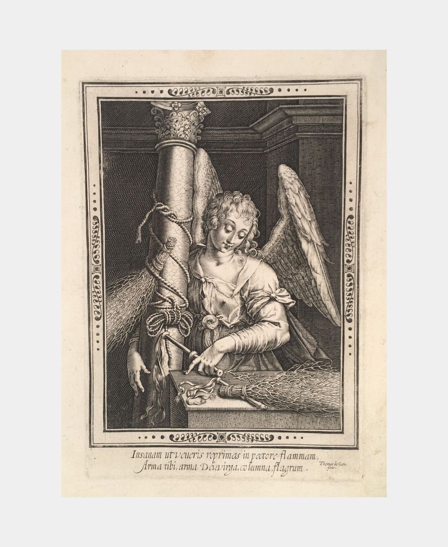 Angel with the instruments of the Passion. Thomas de Leu (1560 – 1612). Burin. Late 16th century. Sheet size: 245 x 181 mm. Block size: 187 x 131 mm. Thomas de Leu, an engraver of Dutch origin, is considered one of the most important portrait engravers of his time. A very fine proof.