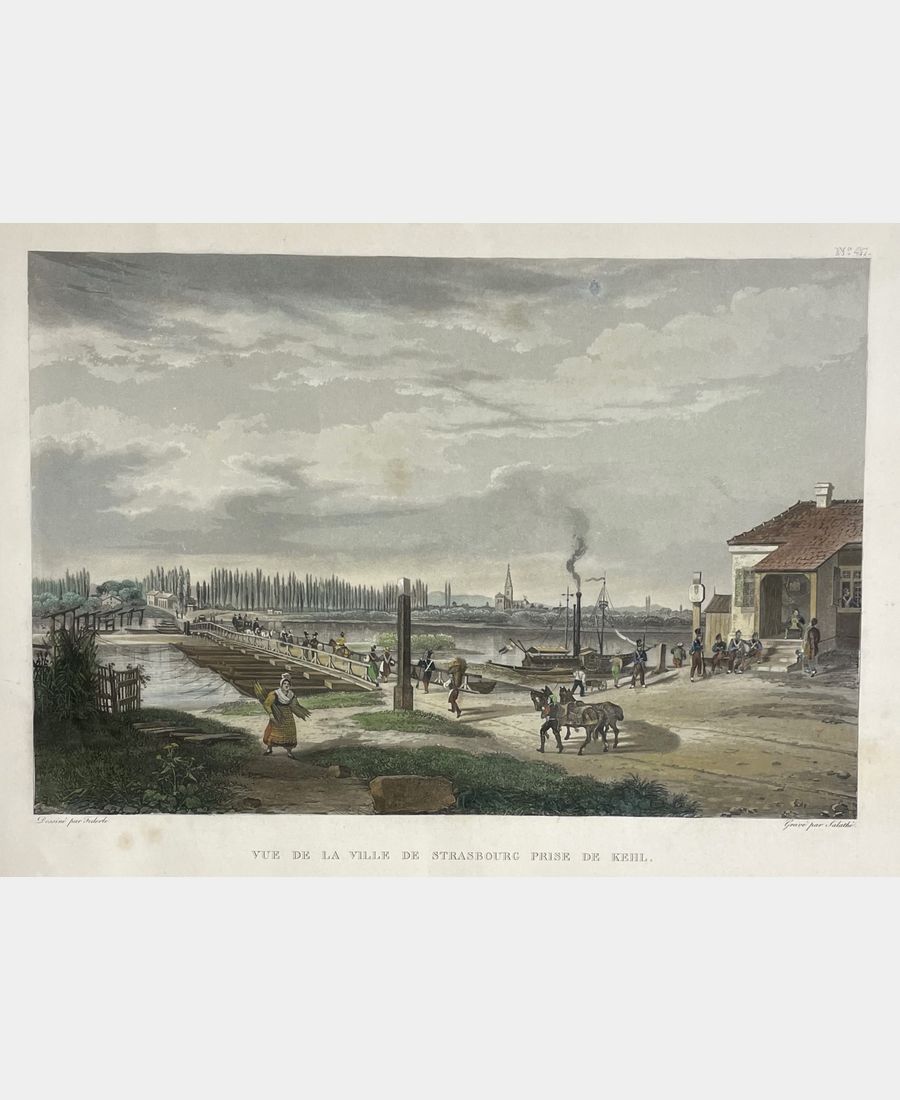 View of Strasbourg from Kehl. Aquatint by Friedrich Salathé (Binningen, near Basel, 1793 – Paris, 1858) after Féderlé. 19th century. Vintage hand coloring enhanced with gum arabic. Published by Bleuler in Schaffhausen. Some foxing, a small halo in the sky. Short margins. Sheet size: 310 x 432 mm. Board size: 291 x 408 mm.